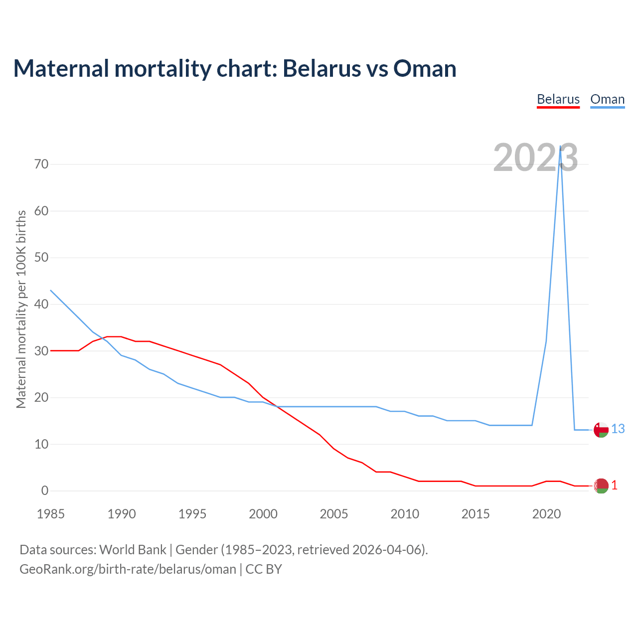 The maternal mortality rate, which is the probability of dying during childbirth or within 42 days of pregnancy termination, is 1 deaths per 100,000 live births in Belarus, compared to 13 deaths in Oman.