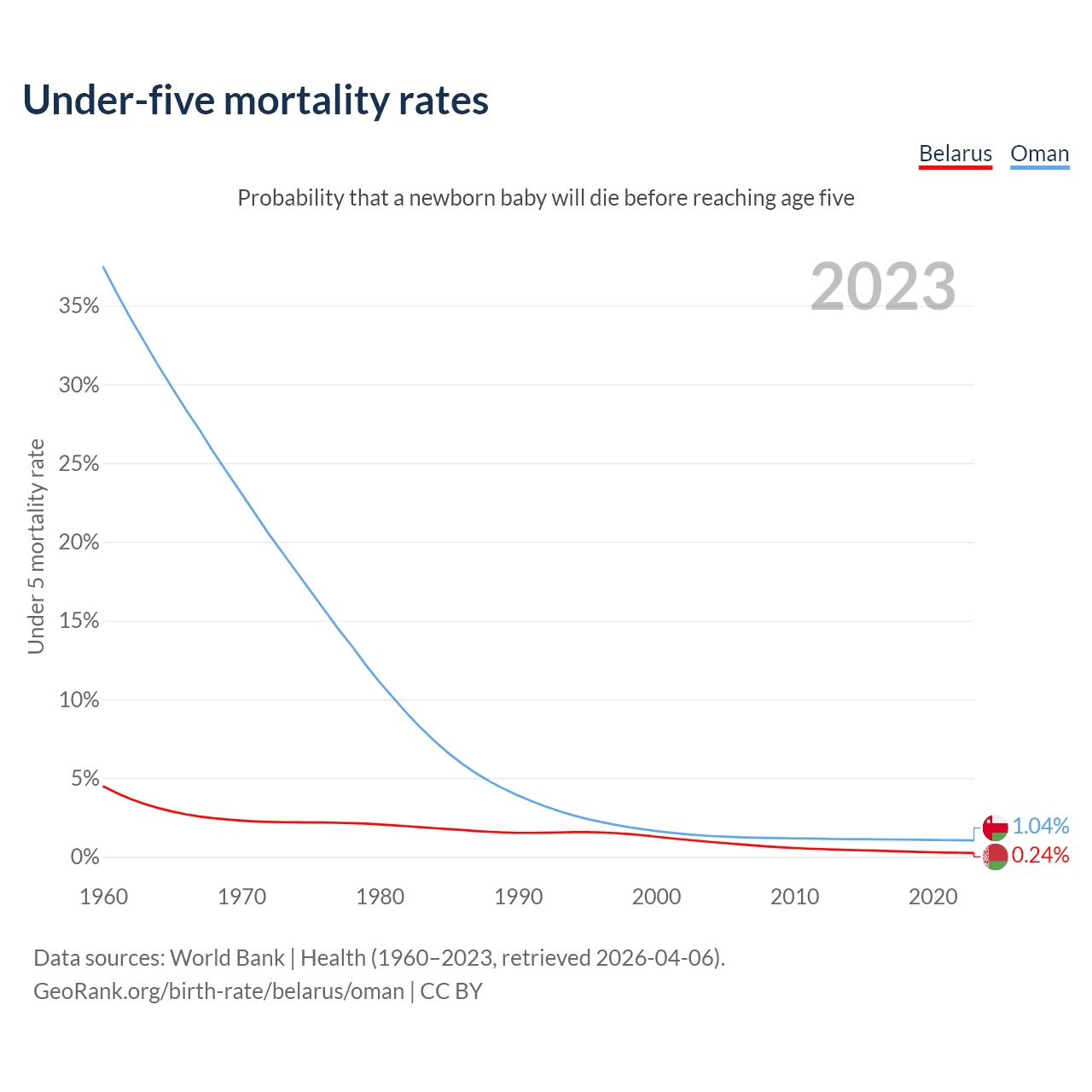 The chance that a newborn baby will die before reaching age five is 0.24% in Belarus and 1.04% in Oman. Above is a chart with historical data on under-five mortality rates.