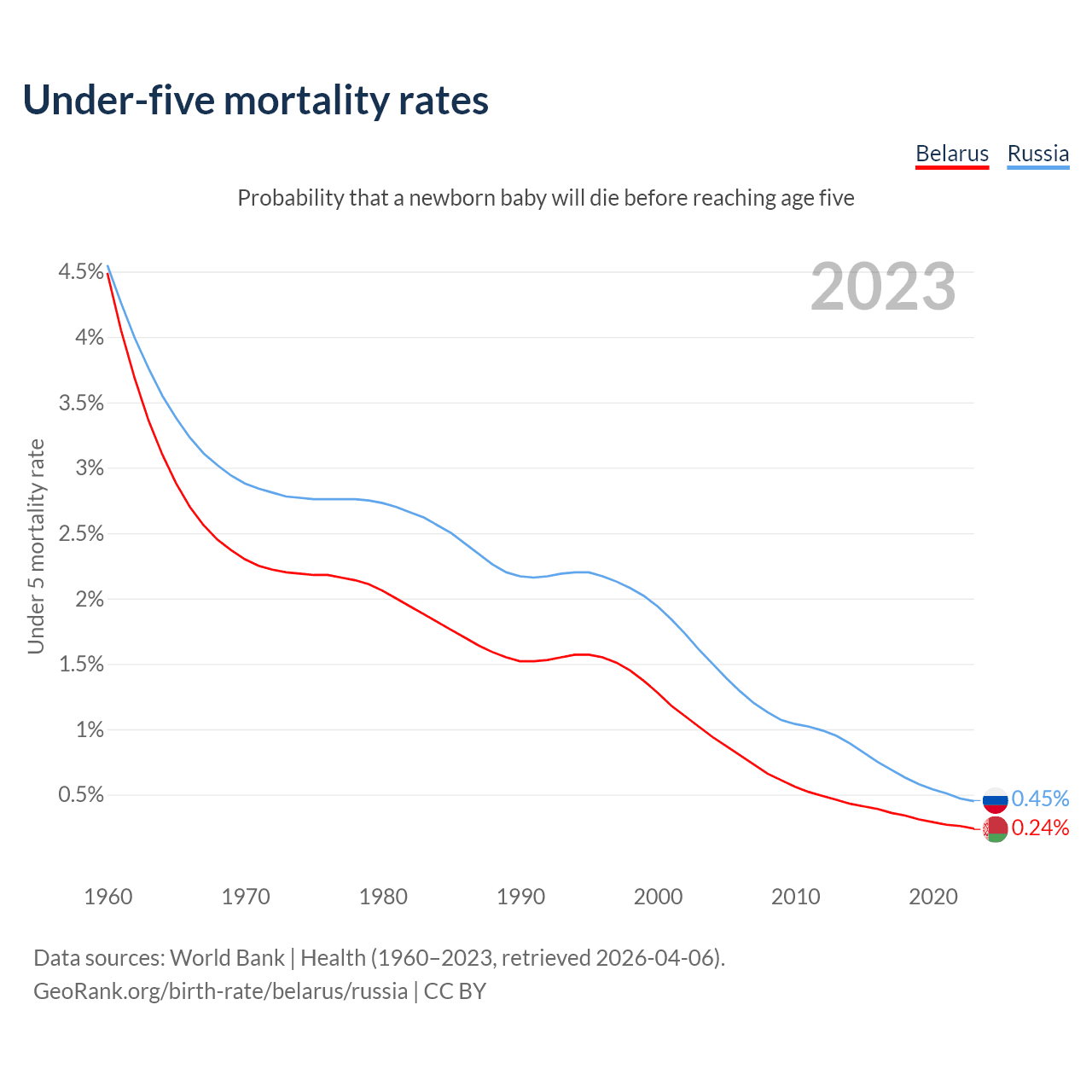 The chance that a newborn baby will die before reaching age five is 0.24% in Belarus and 0.45% in Russia. Above is a chart with historical data on under-five mortality rates.