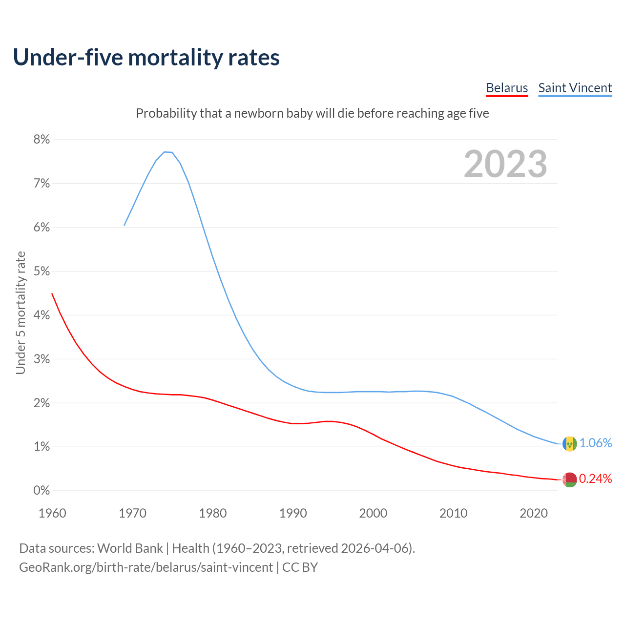The chance that a newborn baby will die before reaching age five is 0.24% in Belarus and 1.06% in Saint Vincent. Above is a chart with historical data on under-five mortality rates.