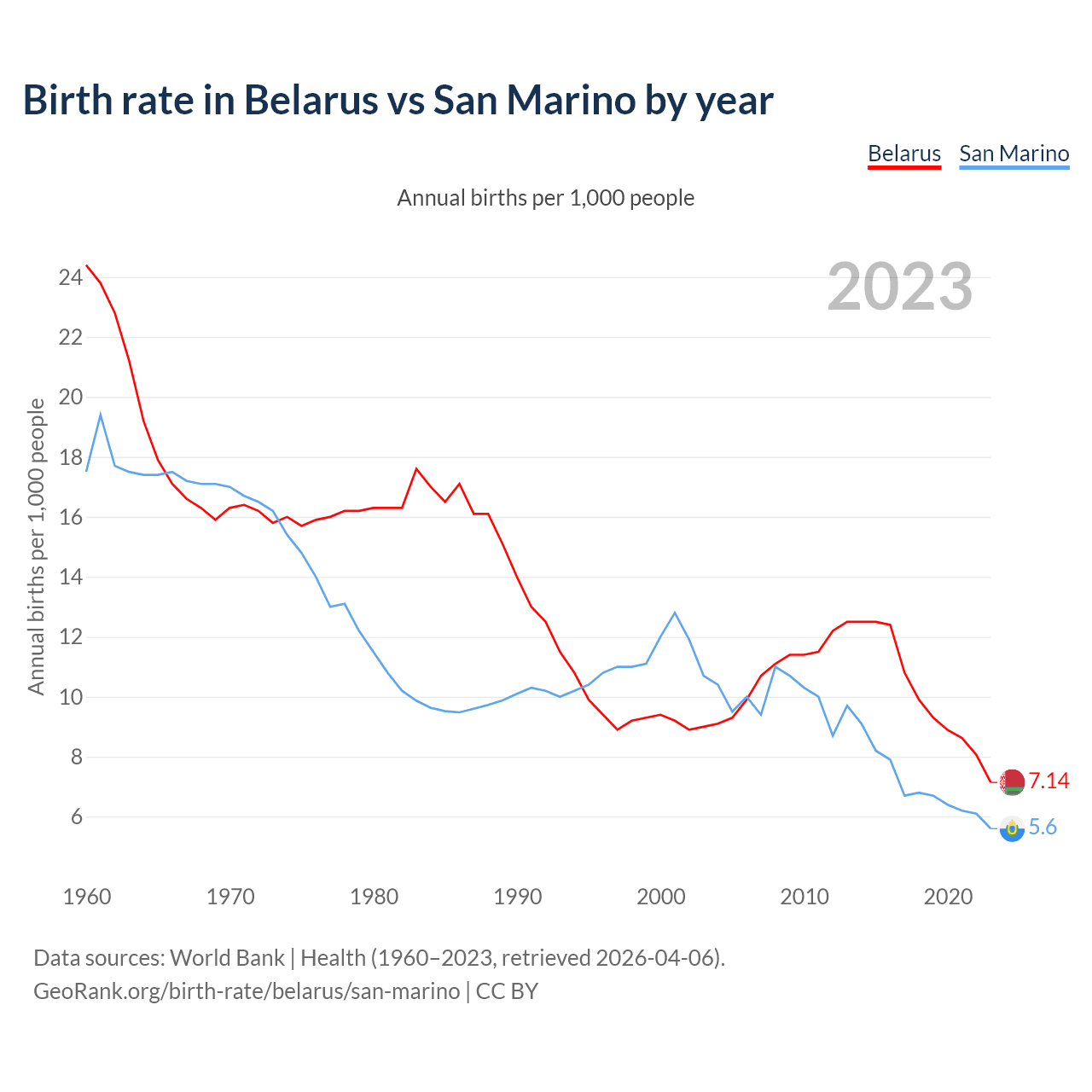 According to the latest available data on birth rates, the fertility rate in Belarus was 1.21 children per woman in 2023, compared to 1.15 in San Marino in 2023. The replacement level is considered to be 2.1 children per woman.