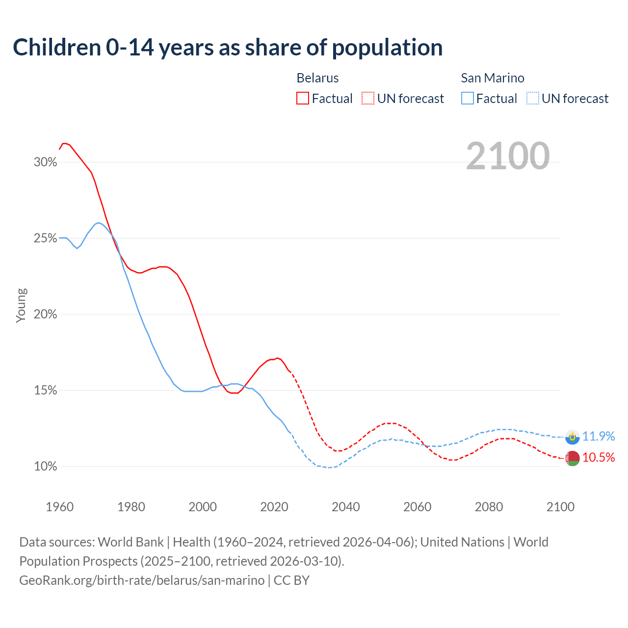 Belarus has an annual birth rate of 7.14 births per 1,000 people, compared to 5.6 for San Marino. The average number of children a woman is expected to have during her lifetime — the fertility rate, is 1.21 in Belarus and 1.15 in San Marino — 4.88% difference.
