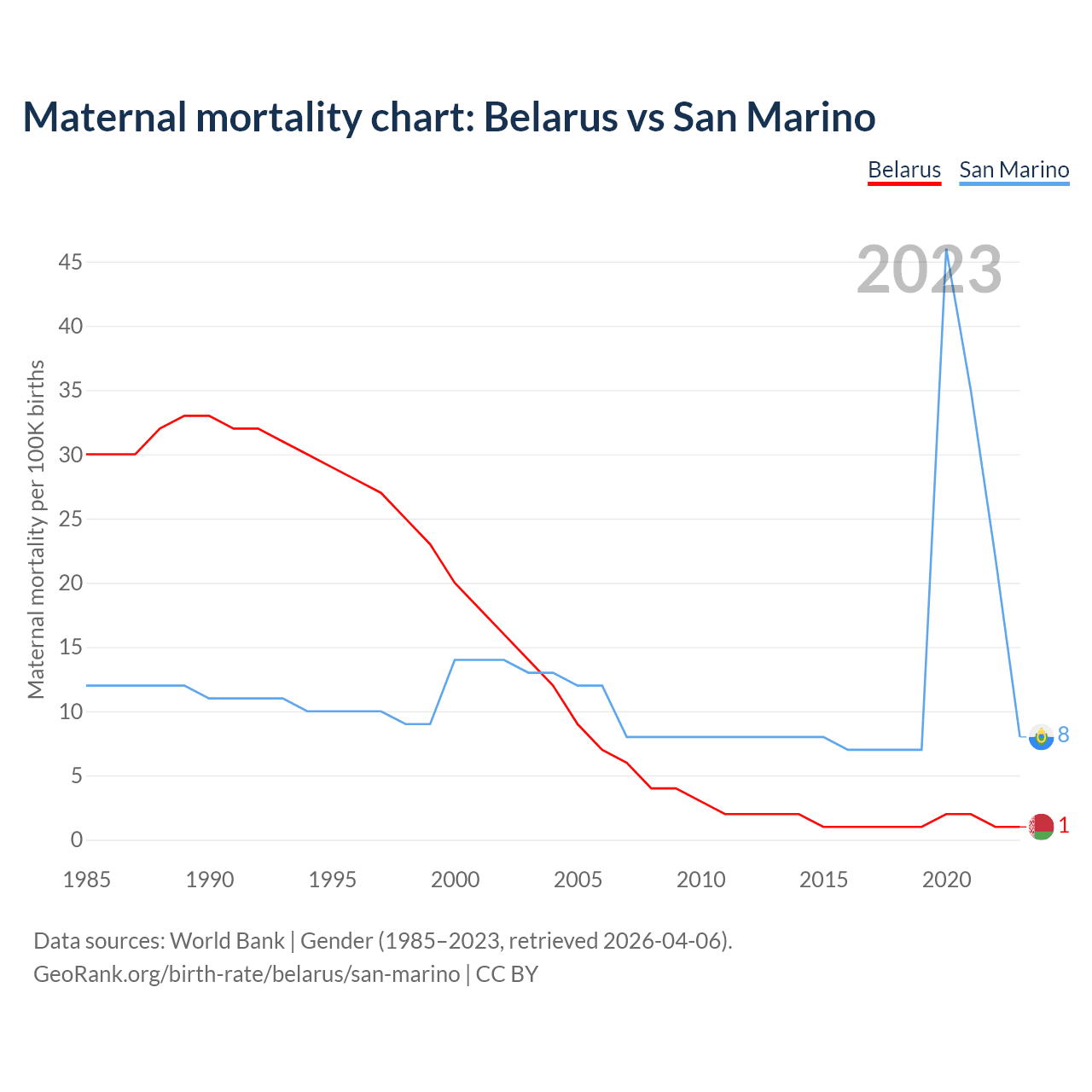 The maternal mortality rate, which is the probability of dying during childbirth or within 42 days of pregnancy termination, is 1 deaths per 100,000 live births in Belarus, compared to 8 deaths in San Marino.