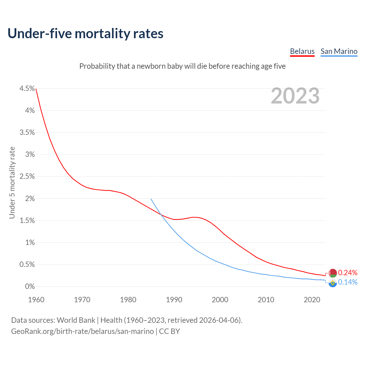 The chance that a newborn baby will die before reaching age five is 0.24% in Belarus and 0.14% in San Marino. Above is a chart with historical data on under-five mortality rates.