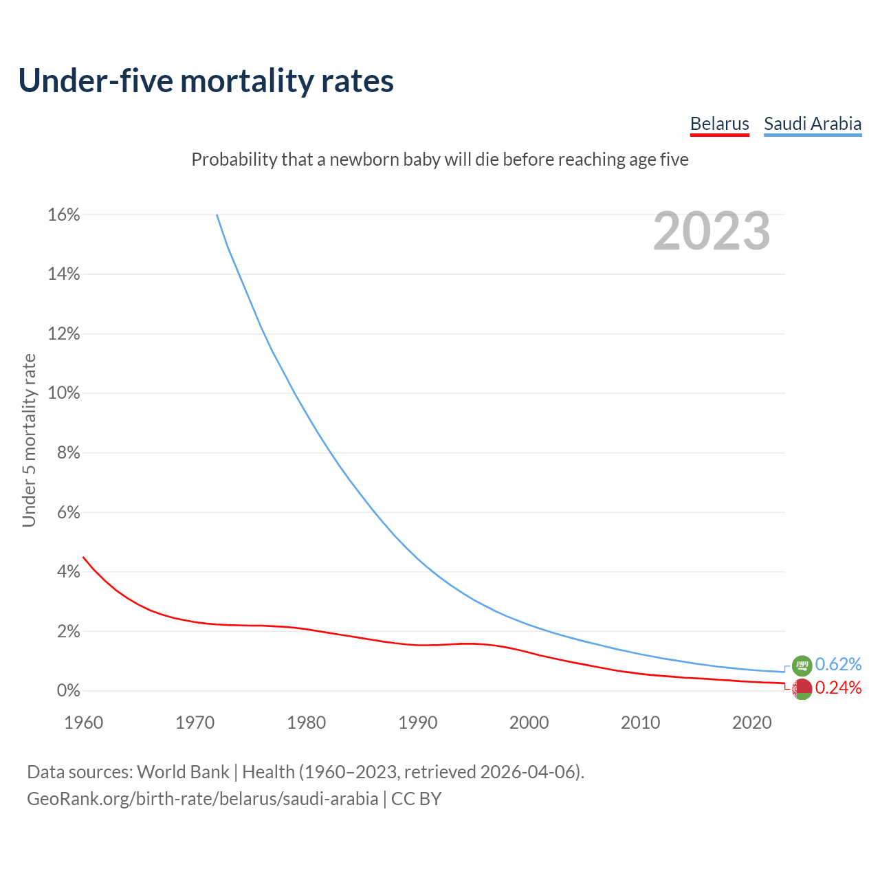 The chance that a newborn baby will die before reaching age five is 0.24% in Belarus and 0.62% in Saudi Arabia. Above is a chart with historical data on under-five mortality rates.