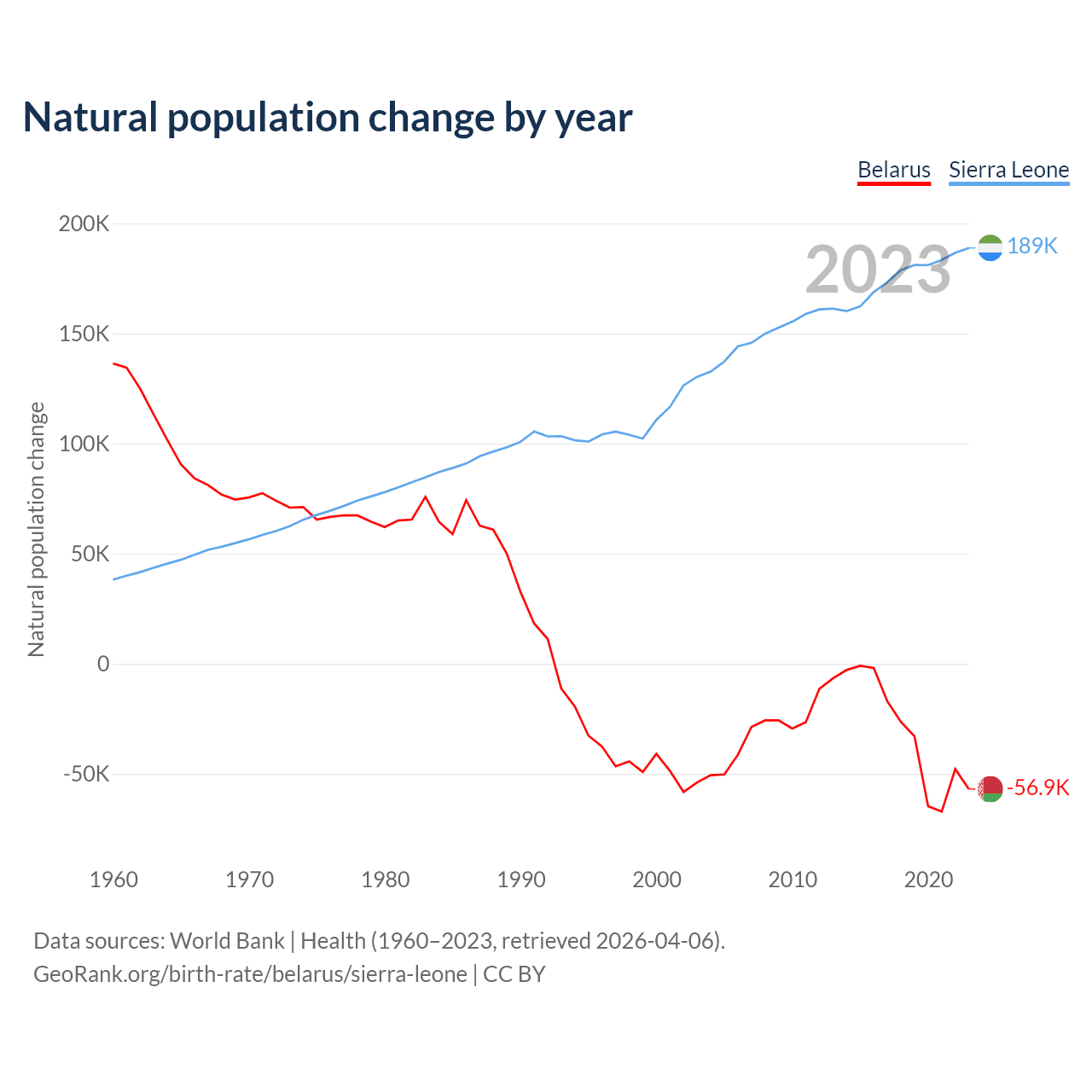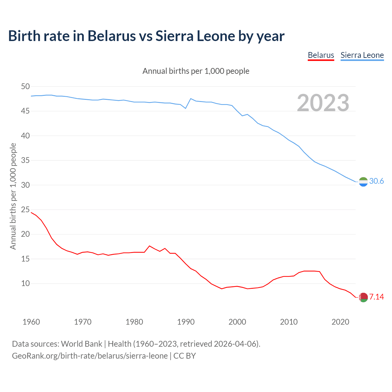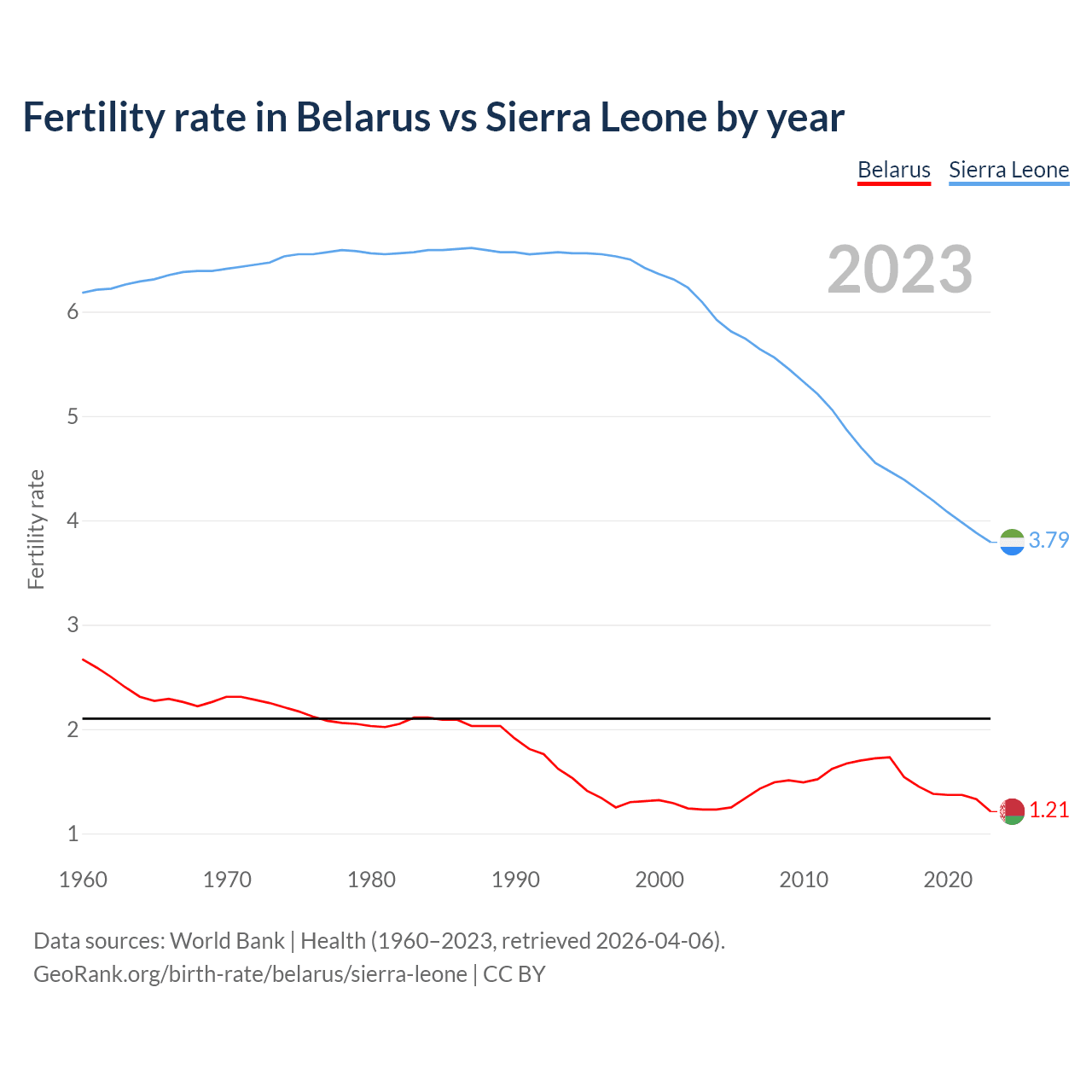 Belarus has an annual birth rate of 7.14 births per 1,000 people, compared to 30.6 for Sierra Leone. The average number of children a woman is expected to have during her lifetime — the fertility rate, is 1.21 in Belarus and 3.79 in Sierra Leone — 213.8% difference.