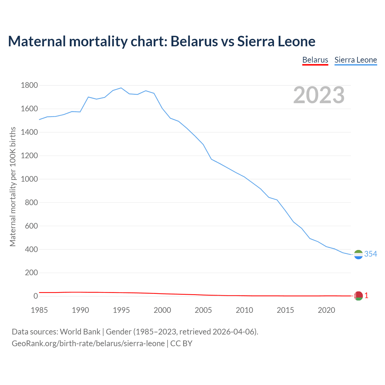 The maternal mortality rate, which is the probability of dying during childbirth or within 42 days of pregnancy termination, is 1 deaths per 100,000 live births in Belarus, compared to 354 deaths in Sierra Leone.