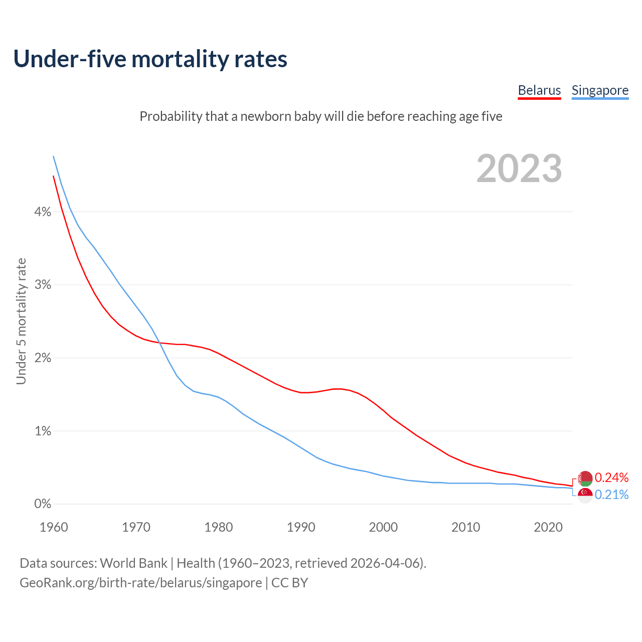 The chance that a newborn baby will die before reaching age five is 0.24% in Belarus and 0.21% in Singapore. Above is a chart with historical data on under-five mortality rates.