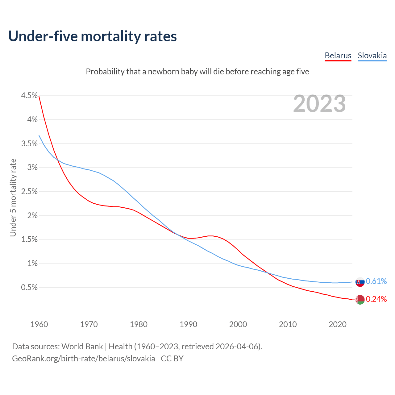 The chance that a newborn baby will die before reaching age five is 0.24% in Belarus and 0.61% in Slovakia. Above is a chart with historical data on under-five mortality rates.