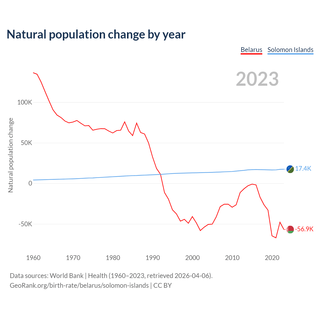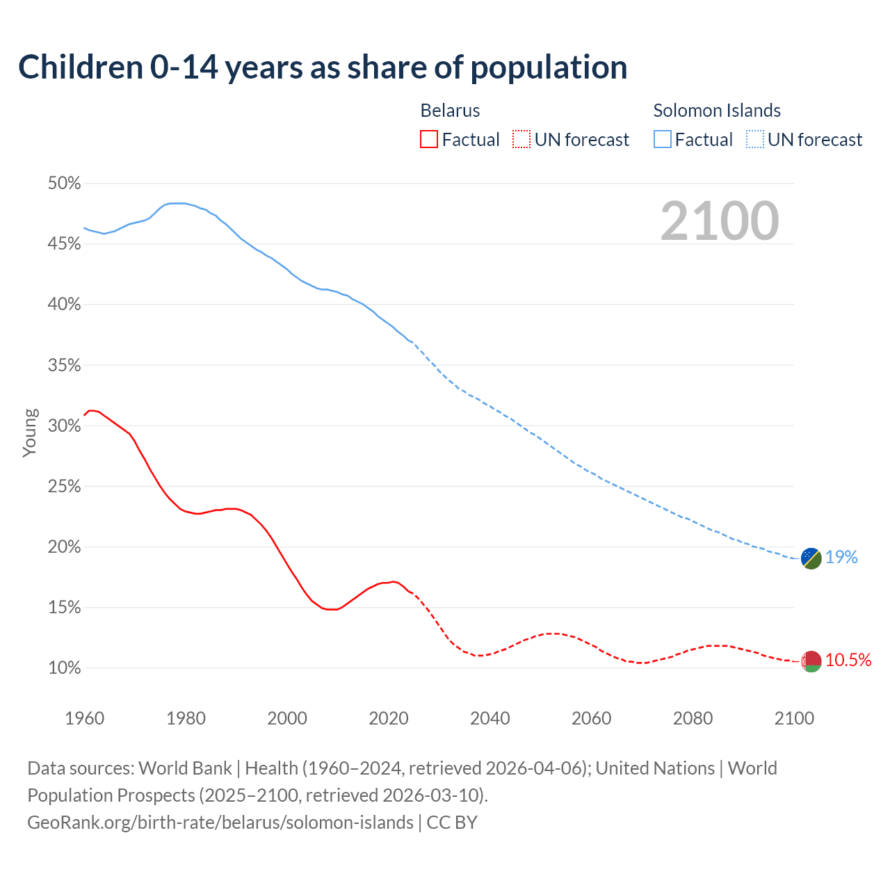 Belarus has an annual birth rate of 7.14 births per 1,000 people, compared to 26.9 for the Solomon Islands. The average number of children a woman is expected to have during her lifetime — the fertility rate, is 1.21 in Belarus and 3.56 in the Solomon Islands — 194.5% difference.
