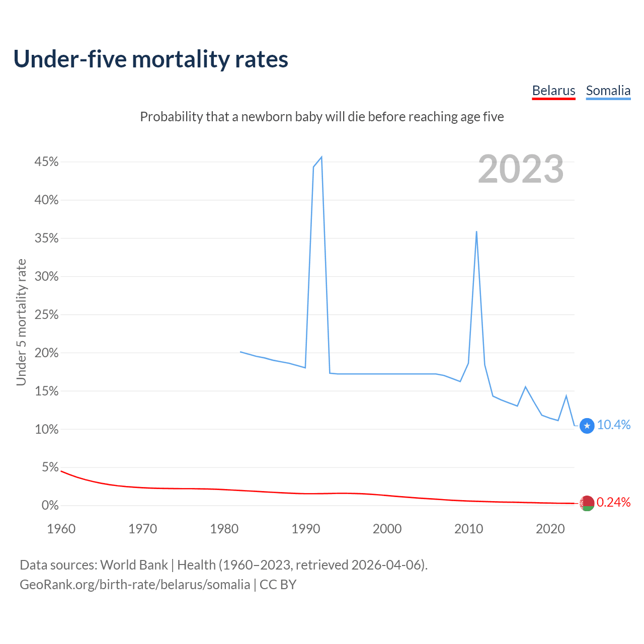 The chance that a newborn baby will die before reaching age five is 0.24% in Belarus and 10.4% in Somalia. Above is a chart with historical data on under-five mortality rates.