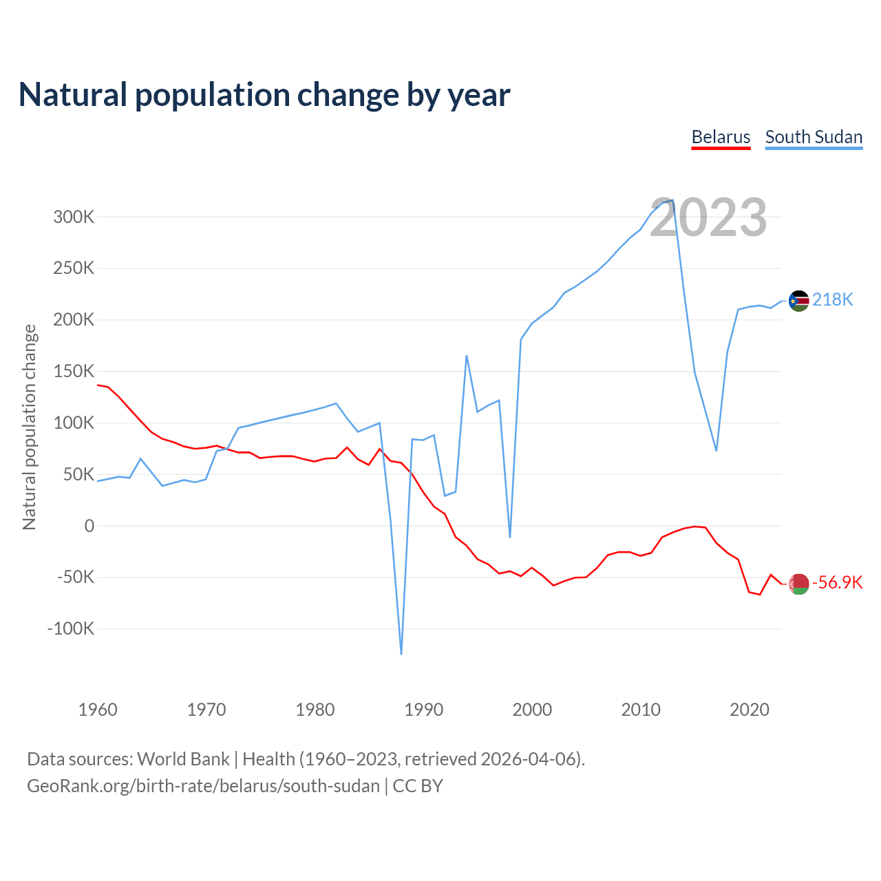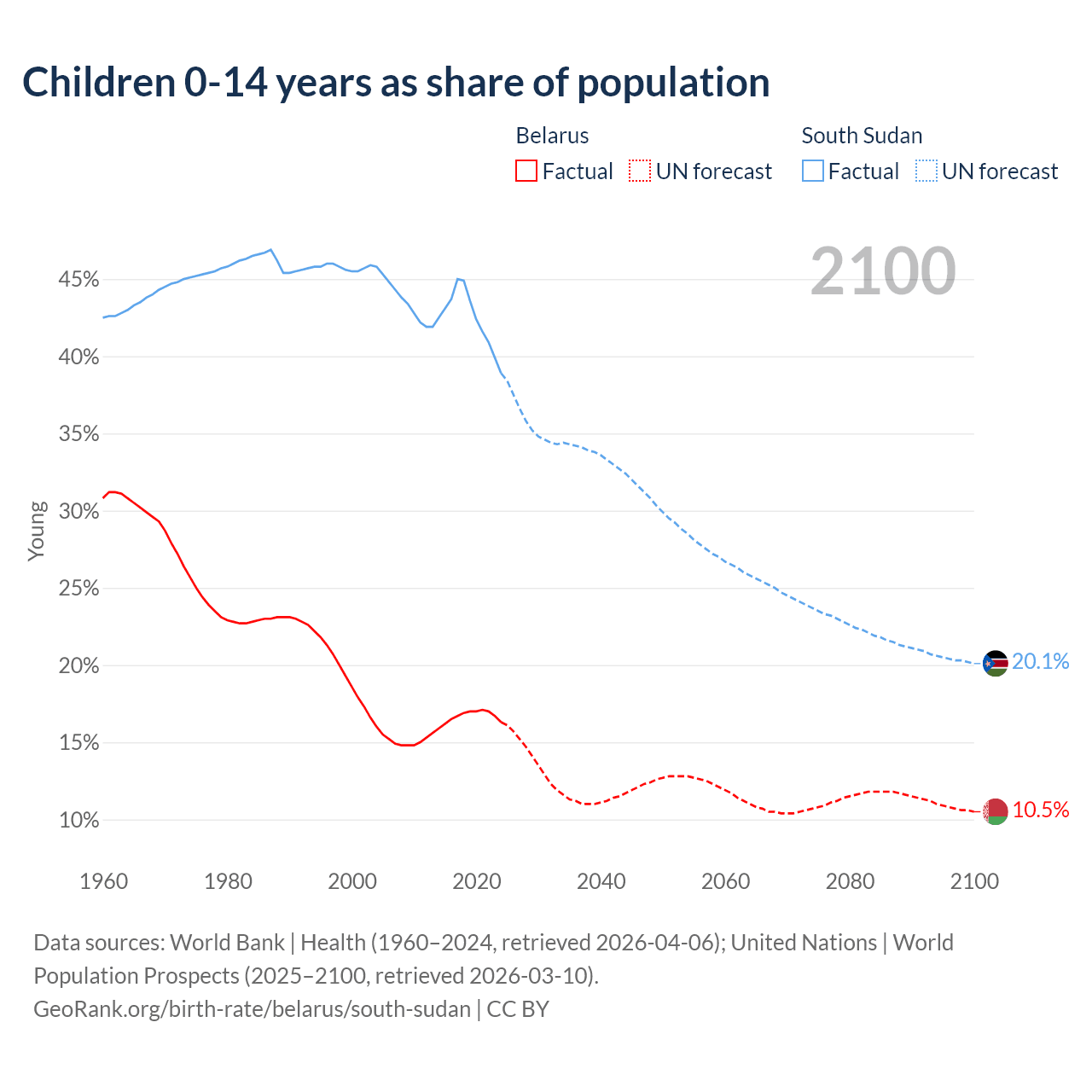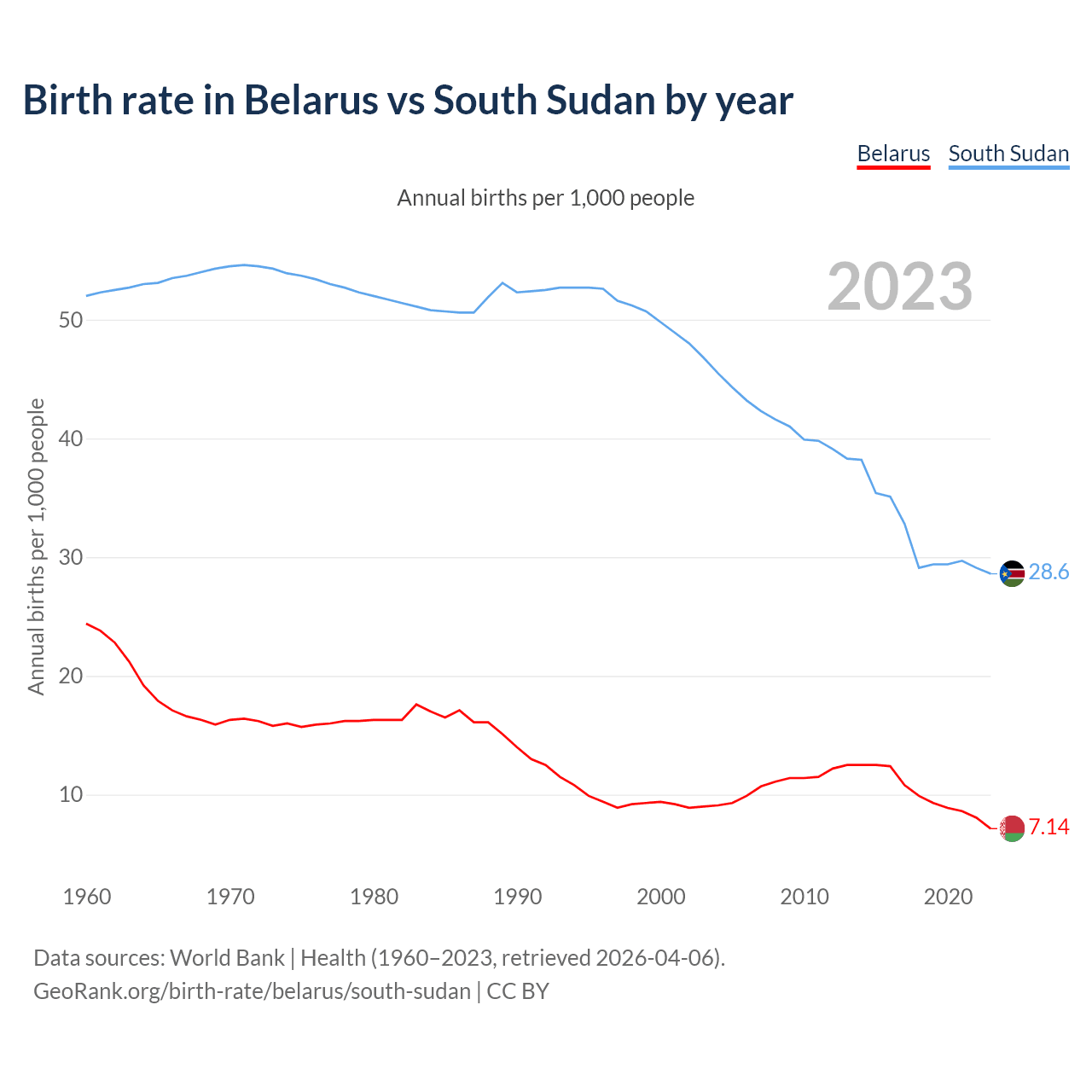 Belarus has an annual birth rate of 7.14 births per 1,000 people, compared to 28.6 for South Sudan. The average number of children a woman is expected to have during her lifetime — the fertility rate, is 1.21 in Belarus and 3.86 in South Sudan — 219.9% difference.