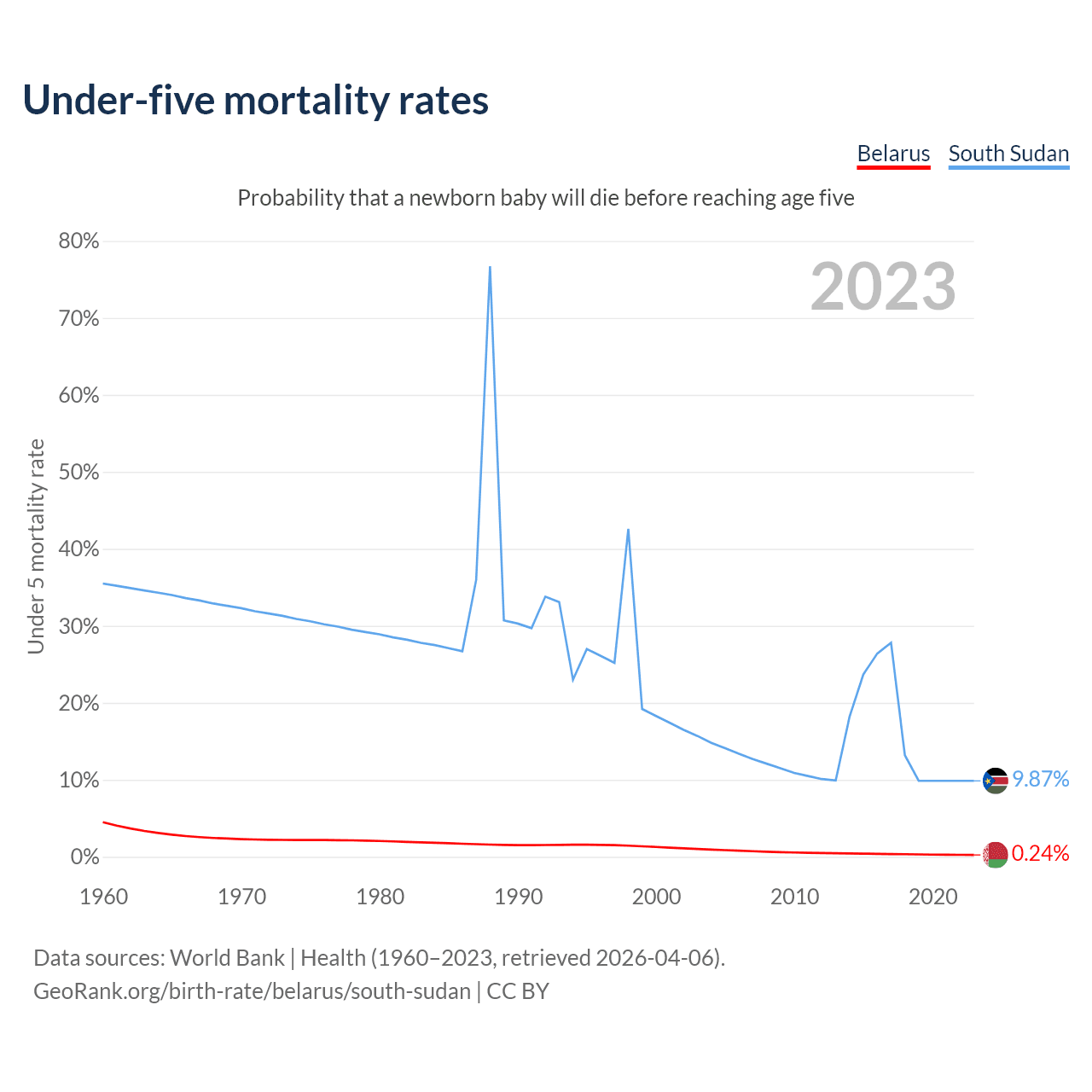 The chance that a newborn baby will die before reaching age five is 0.24% in Belarus and 9.87% in South Sudan. Above is a chart with historical data on under-five mortality rates.