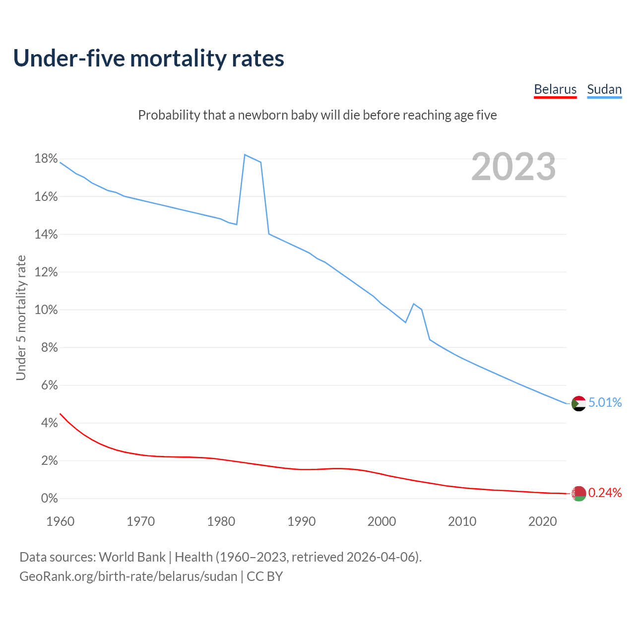 The chance that a newborn baby will die before reaching age five is 0.24% in Belarus and 5.01% in Sudan. Above is a chart with historical data on under-five mortality rates.