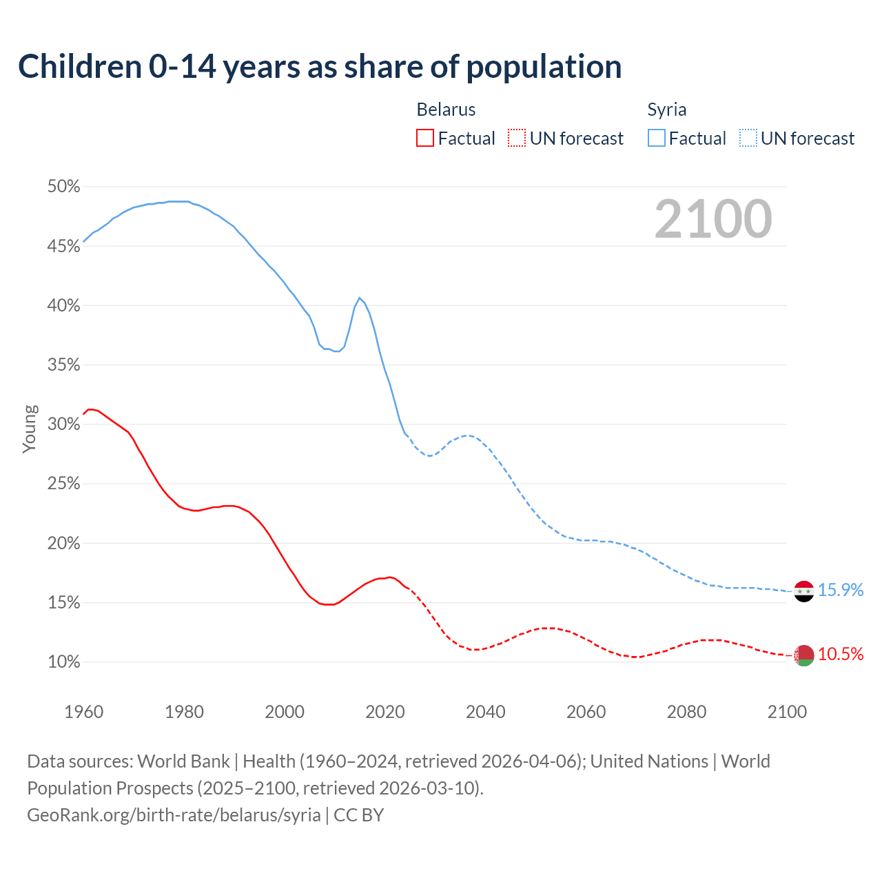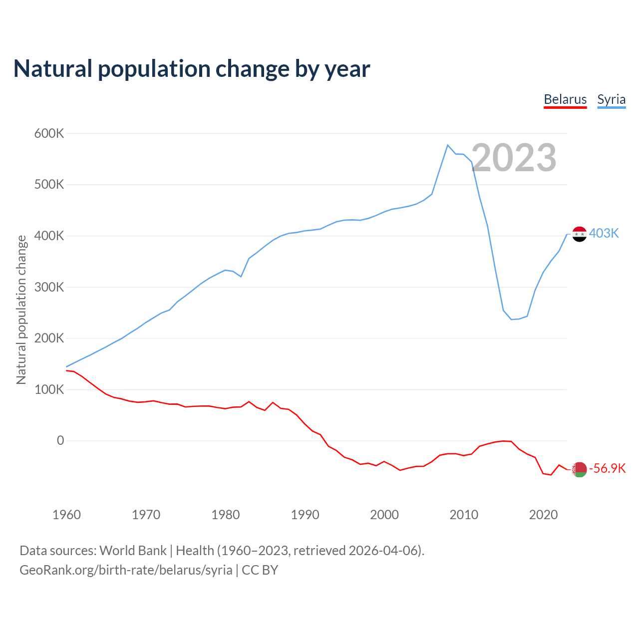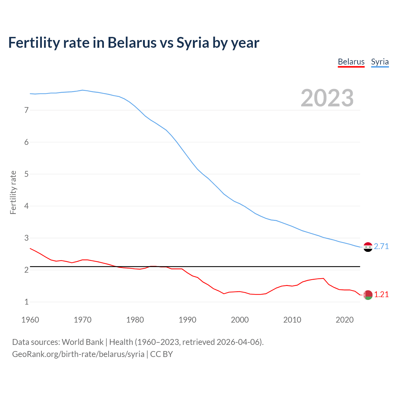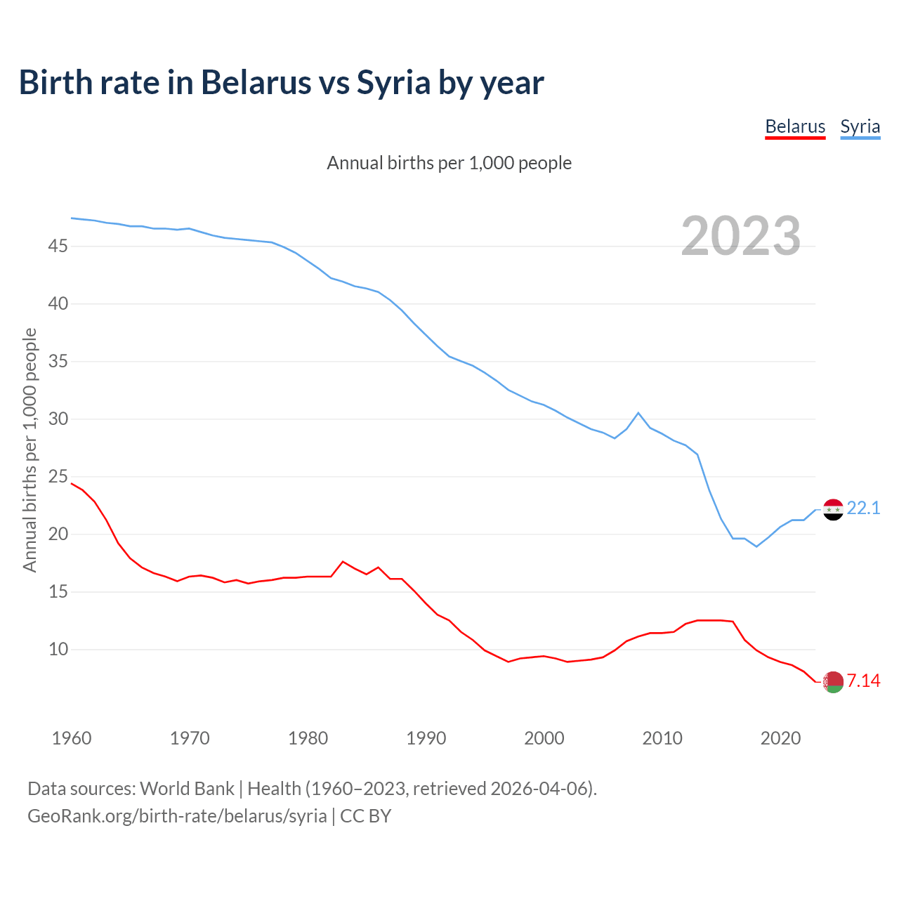 Belarus has an annual birth rate of 7.14 births per 1,000 people, compared to 22.1 for Syria. The average number of children a woman is expected to have during her lifetime — the fertility rate, is 1.21 in Belarus and 2.71 in Syria — 124.5% difference.