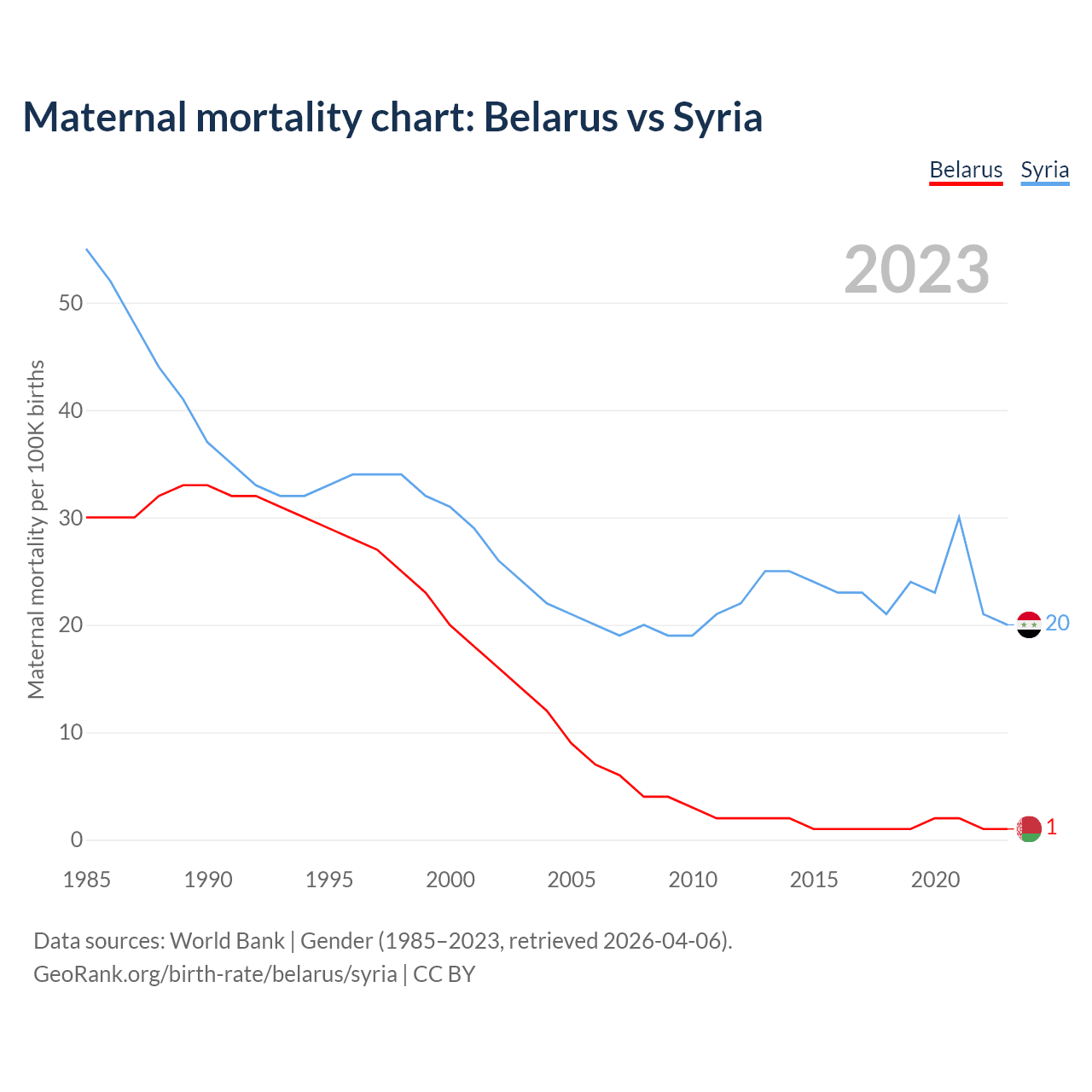 The maternal mortality rate, which is the probability of dying during childbirth or within 42 days of pregnancy termination, is 1 deaths per 100,000 live births in Belarus, compared to 20 deaths in Syria.