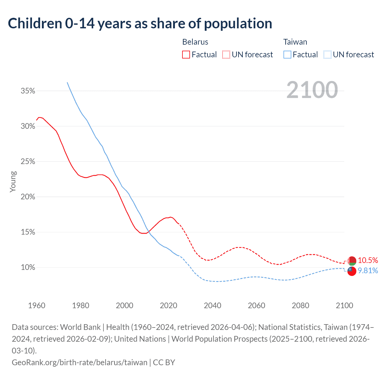 Children aged 0-14 make up 16.3% of the population in Belarus and 11.7% in Taiwan in 2024, compared to 23.1% and 27.1% respectively in 1990.