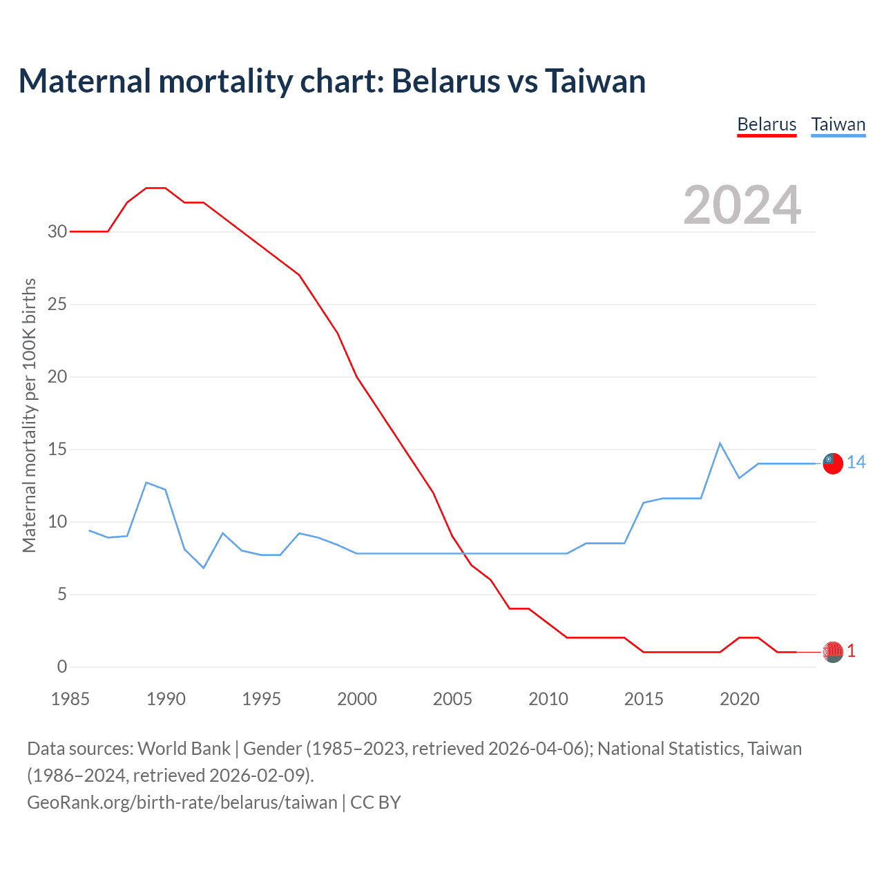The maternal mortality rate, which is the probability of dying during childbirth or within 42 days of pregnancy termination, is 1 deaths per 100,000 live births in Belarus, compared to 14 deaths in Taiwan.