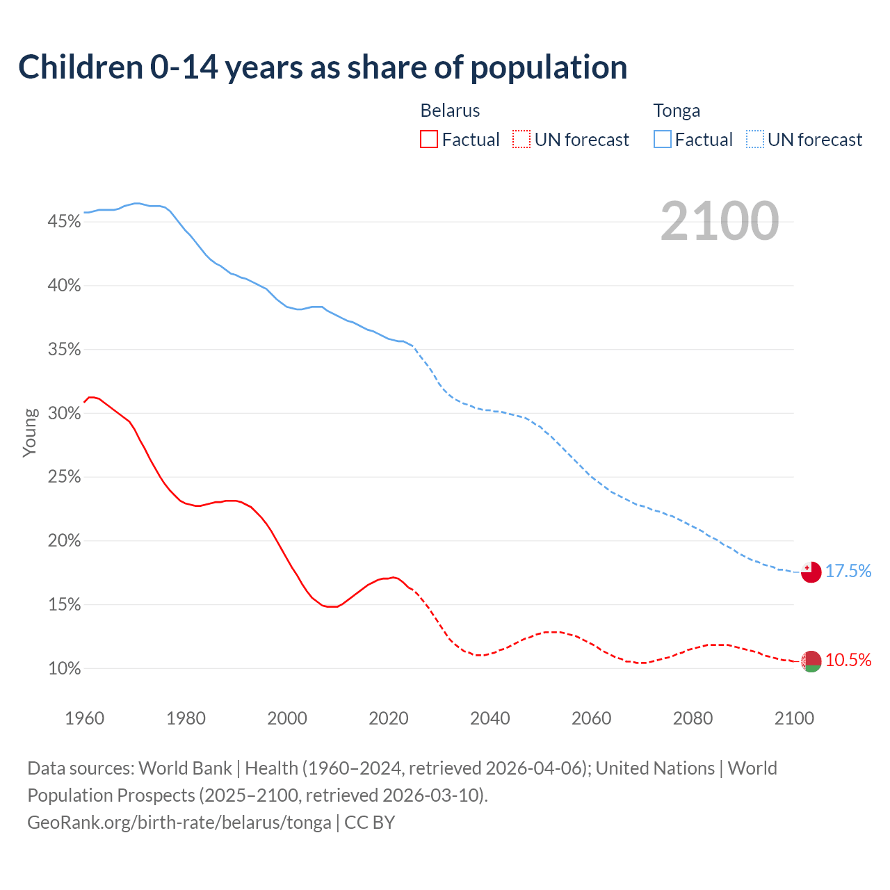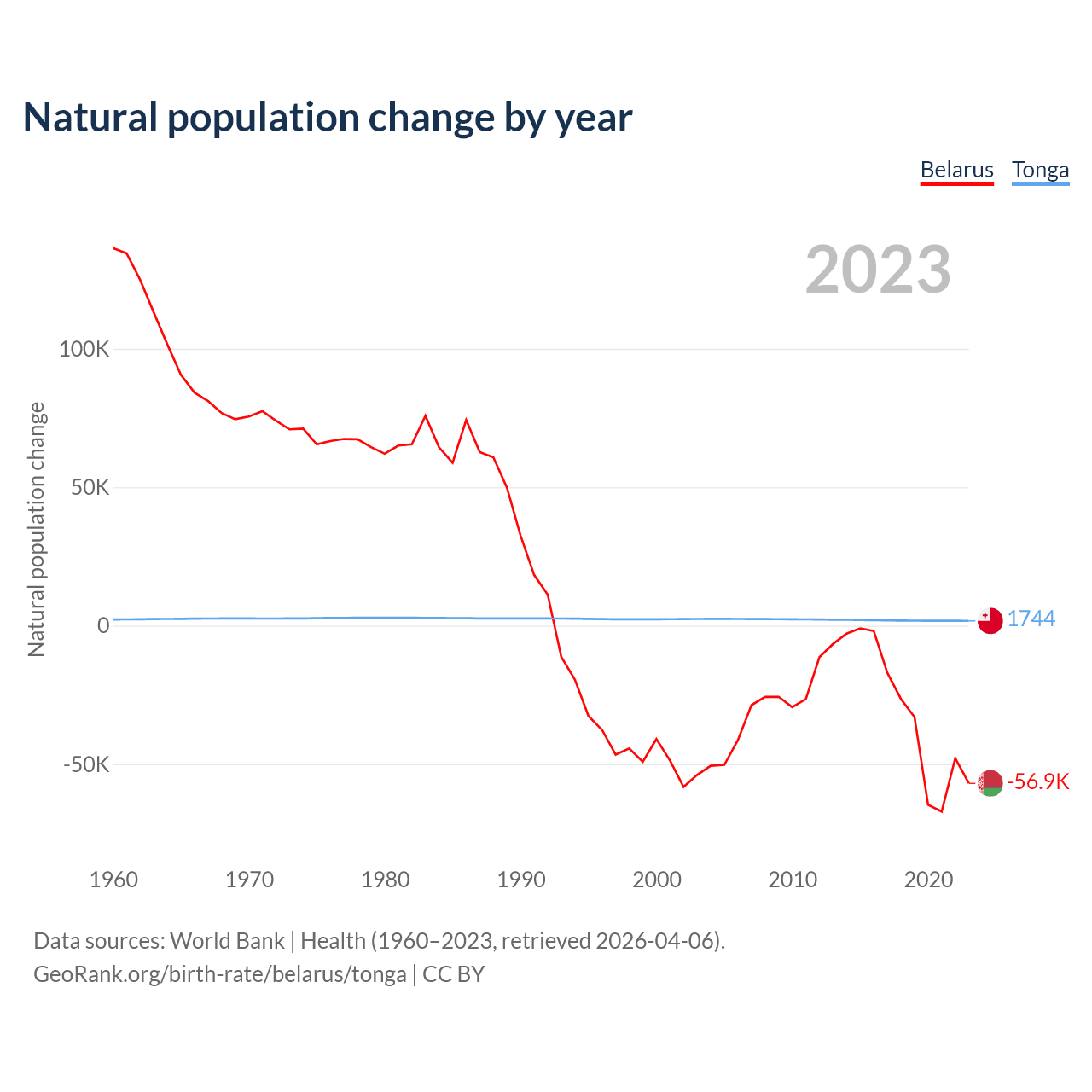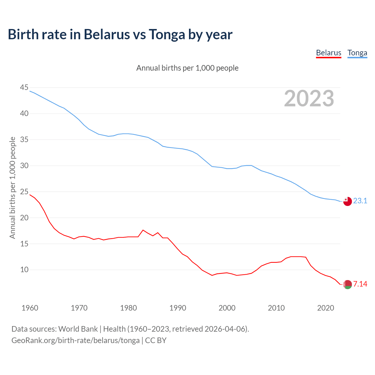 Belarus has an annual birth rate of 7.14 births per 1,000 people, compared to 23.1 for Tonga. The average number of children a woman is expected to have during her lifetime — the fertility rate, is 1.21 in Belarus and 3.13 in Tonga — 159% difference.