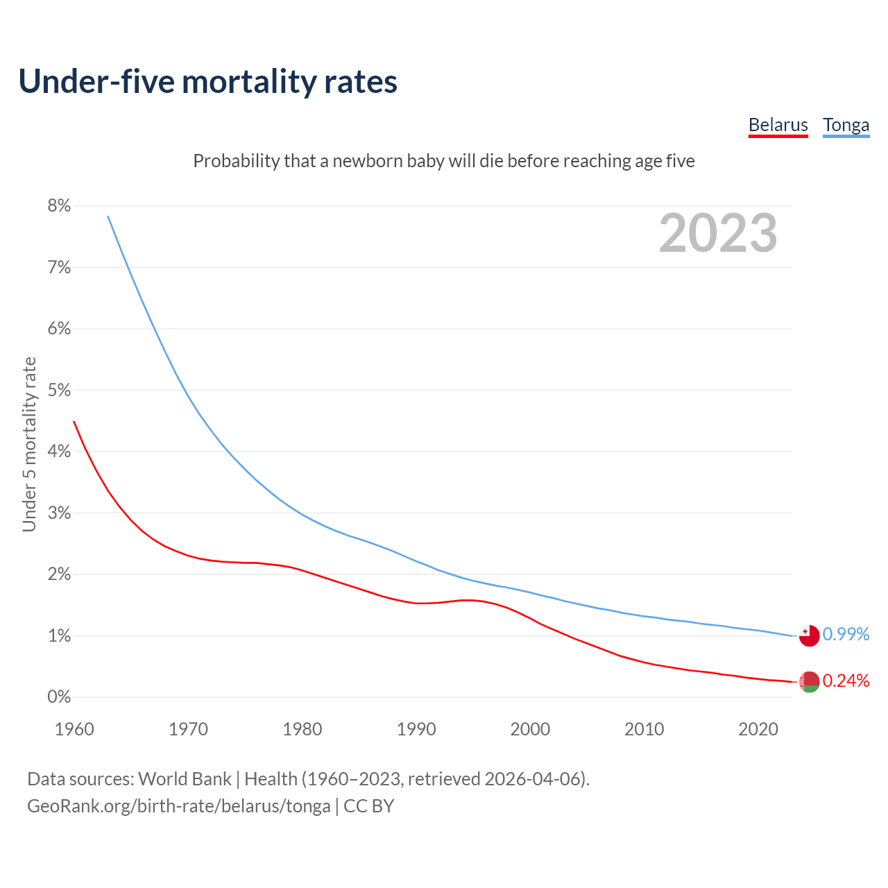 The chance that a newborn baby will die before reaching age five is 0.24% in Belarus and 0.99% in Tonga. Above is a chart with historical data on under-five mortality rates.
