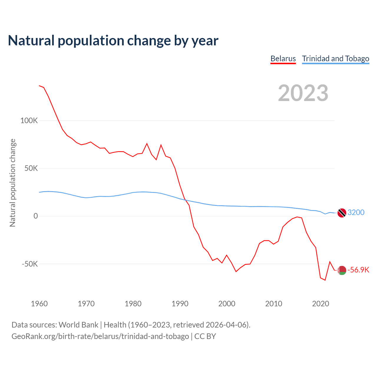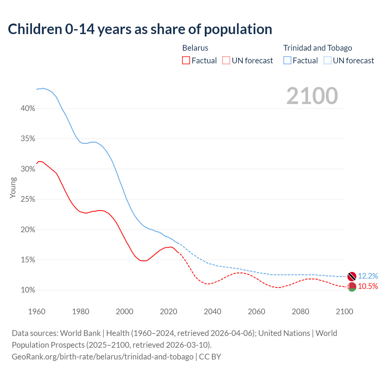 According to the latest available data on birth rates, the fertility rate in Belarus was 1.21 children per woman in 2023, compared to 1.53 in Trinidad and Tobago in 2023. The replacement level is considered to be 2.1 children per woman.