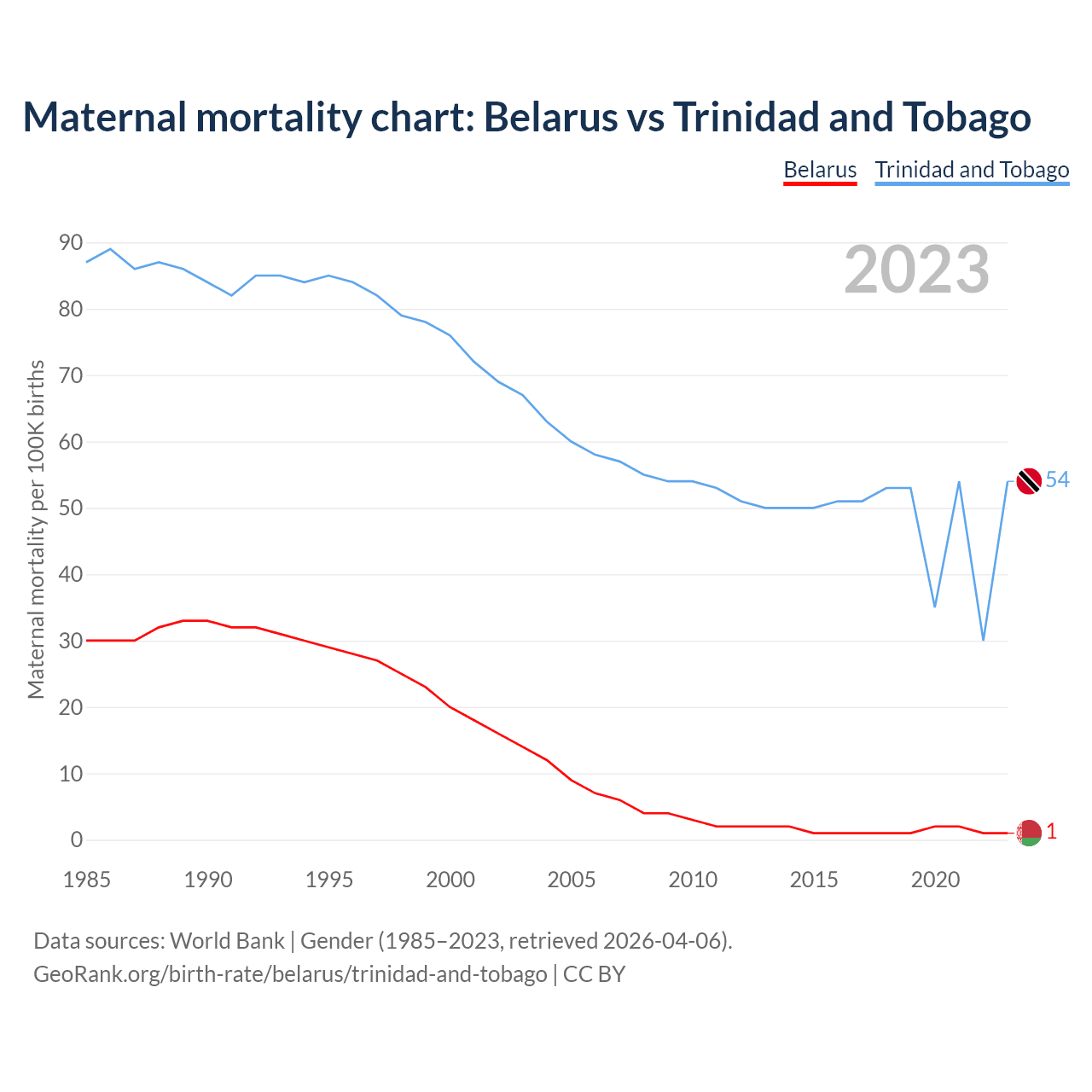 The maternal mortality rate, which is the probability of dying during childbirth or within 42 days of pregnancy termination, is 1 deaths per 100,000 live births in Belarus, compared to 54 deaths in Trinidad and Tobago.