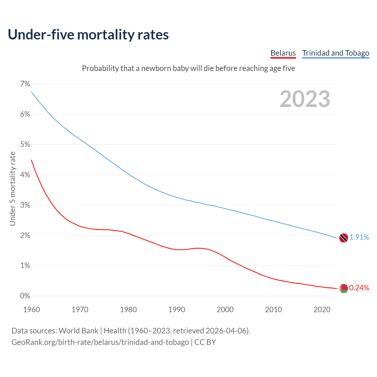 The chance that a newborn baby will die before reaching age five is 0.24% in Belarus and 1.91% in Trinidad and Tobago. Above is a chart with historical data on under-five mortality rates.