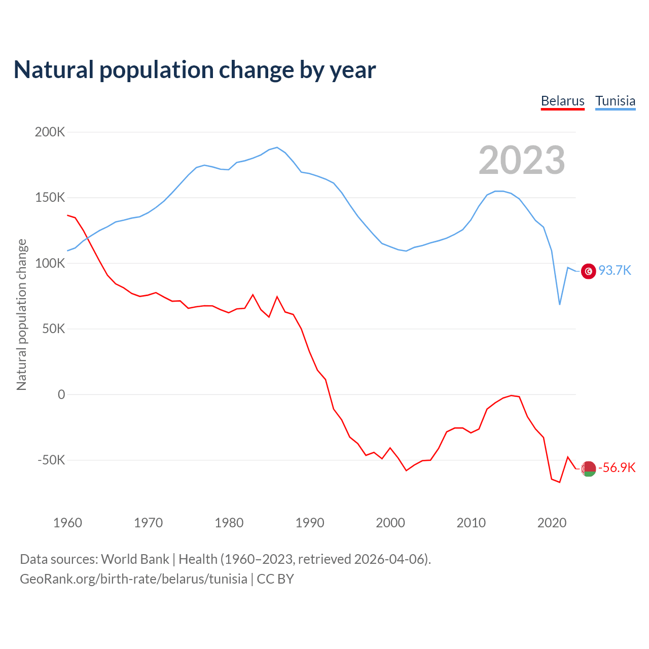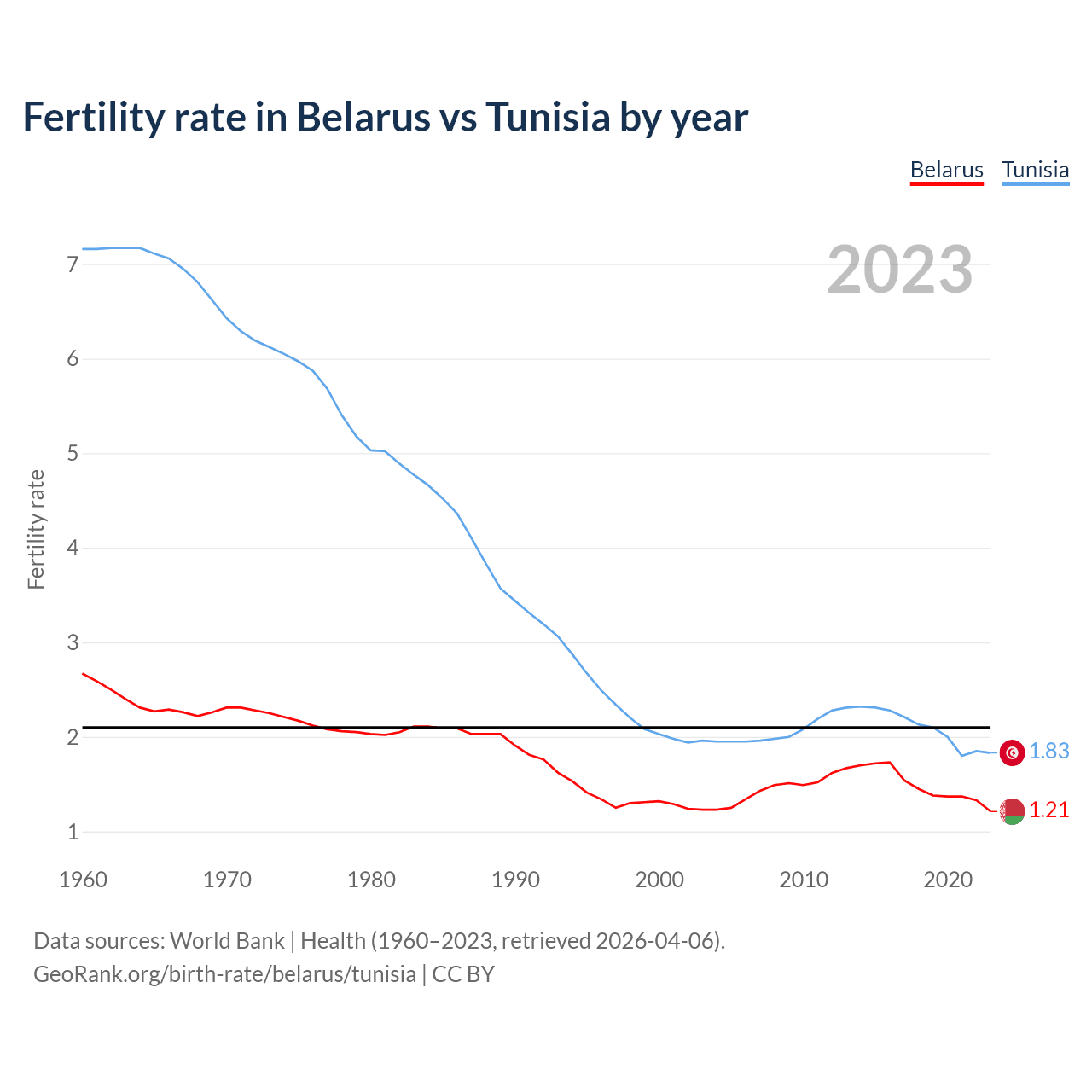 According to the latest available data on birth rates, the fertility rate in Belarus was 1.21 children per woman in 2023, compared to 1.83 in Tunisia in 2023. The replacement level is considered to be 2.1 children per woman.