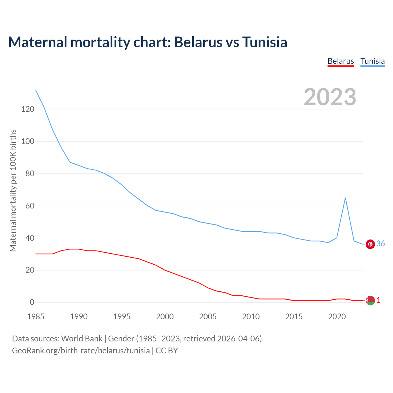 The maternal mortality rate, which is the probability of dying during childbirth or within 42 days of pregnancy termination, is 1 deaths per 100,000 live births in Belarus, compared to 36 deaths in Tunisia.