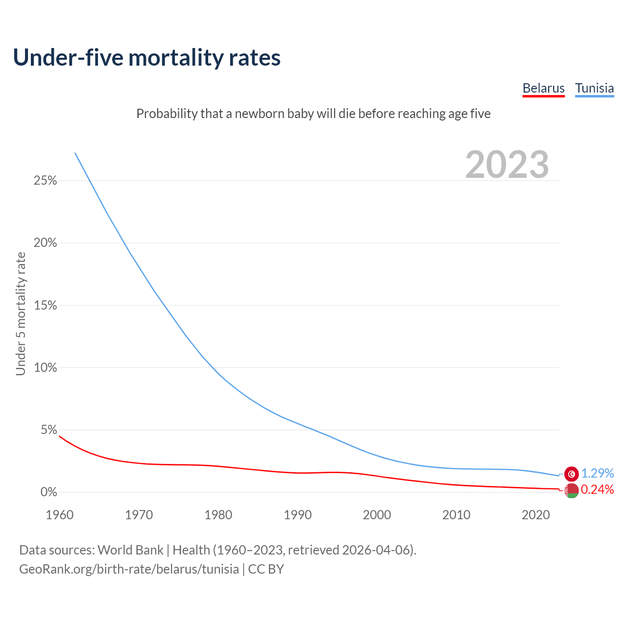 The chance that a newborn baby will die before reaching age five is 0.24% in Belarus and 1.29% in Tunisia. Above is a chart with historical data on under-five mortality rates.