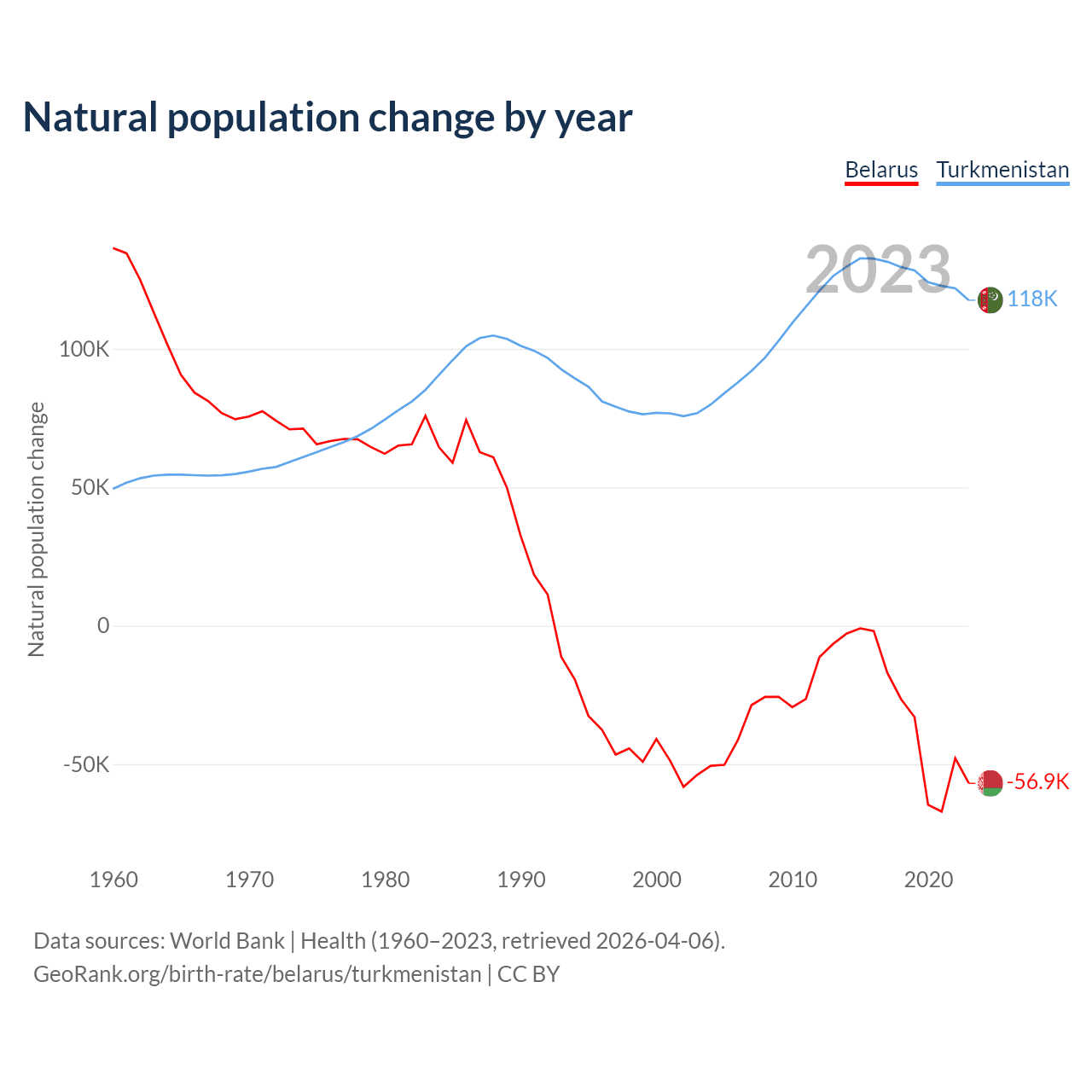 1960 vs 2023, the fertility rate has decreased by 54.8% in Belarus and by 59.2% in Turkmenistan — in 1960, it was 2.67 and 6.59, respectively.