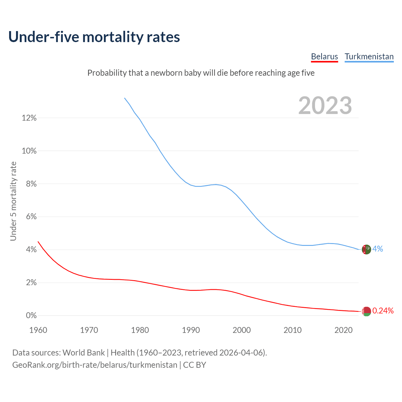 The chance that a newborn baby will die before reaching age five is 0.24% in Belarus and 4% in Turkmenistan. Above is a chart with historical data on under-five mortality rates.