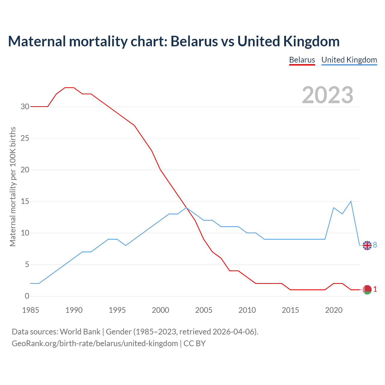 The maternal mortality rate, which is the probability of dying during childbirth or within 42 days of pregnancy termination, is 1 deaths per 100,000 live births in Belarus, compared to 8 deaths in the United Kingdom.