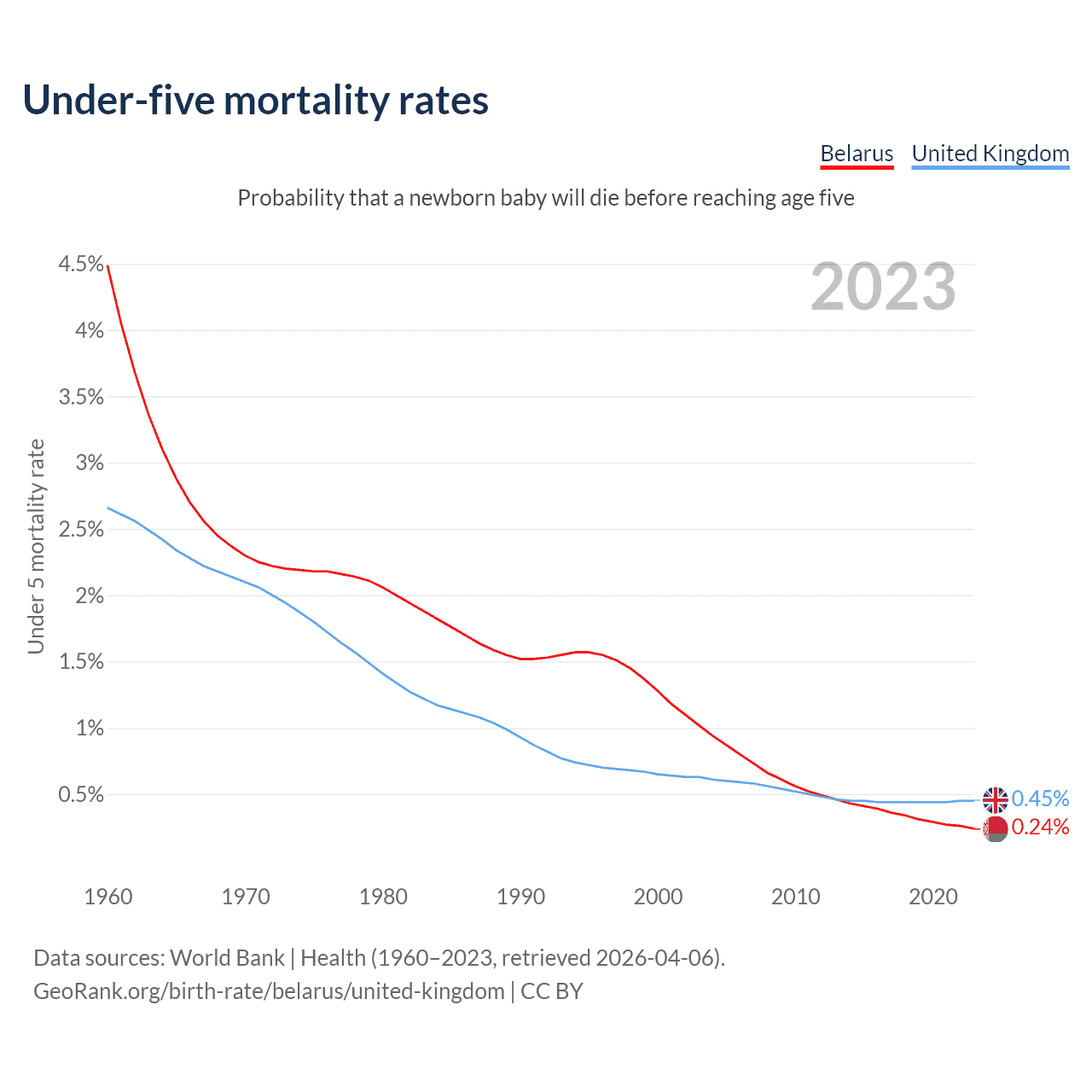 The chance that a newborn baby will die before reaching age five is 0.24% in Belarus and 0.45% in the United Kingdom. Above is a chart with historical data on under-five mortality rates.