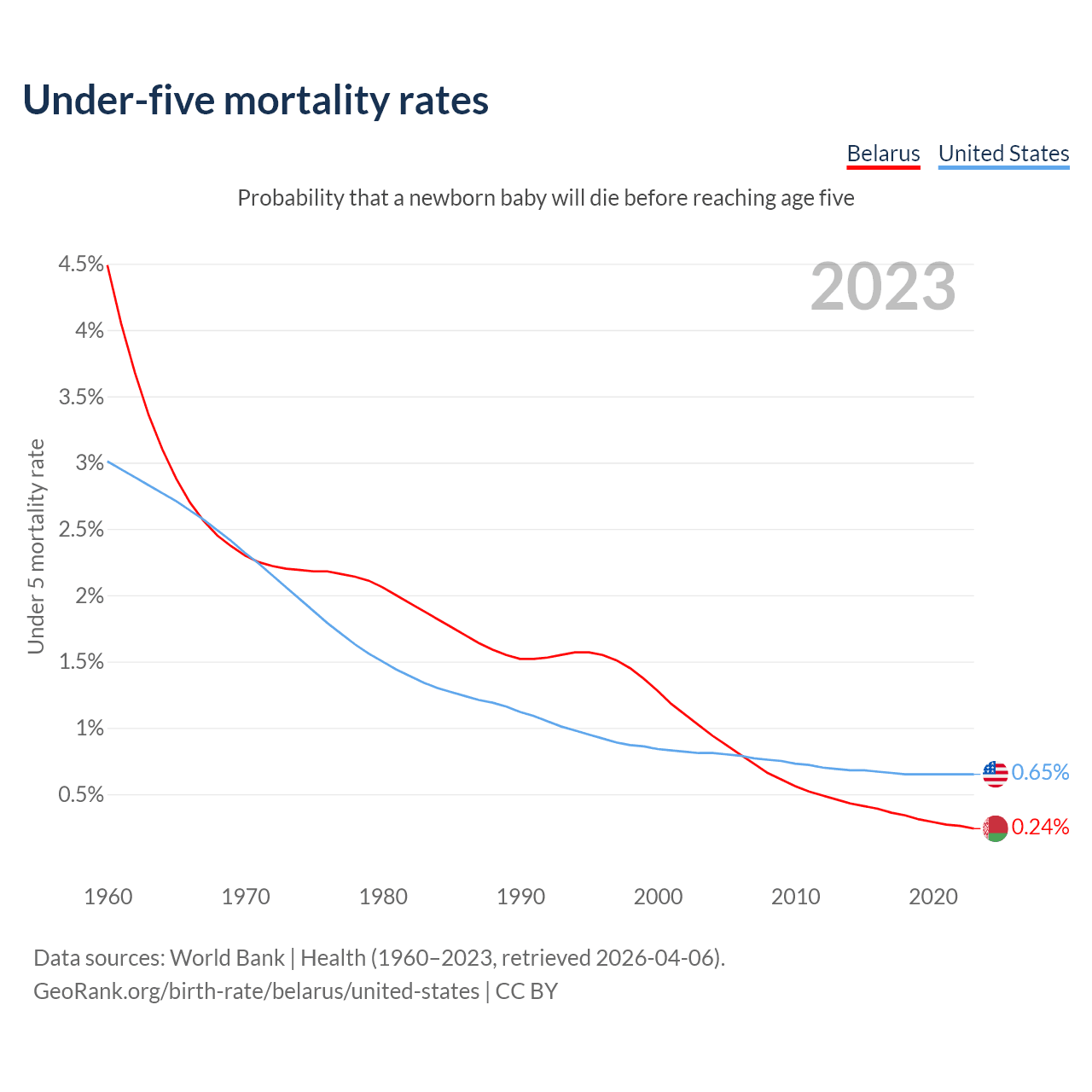 The chance that a newborn baby will die before reaching age five is 0.24% in Belarus and 0.65% in the United States. Above is a chart with historical data on under-five mortality rates.