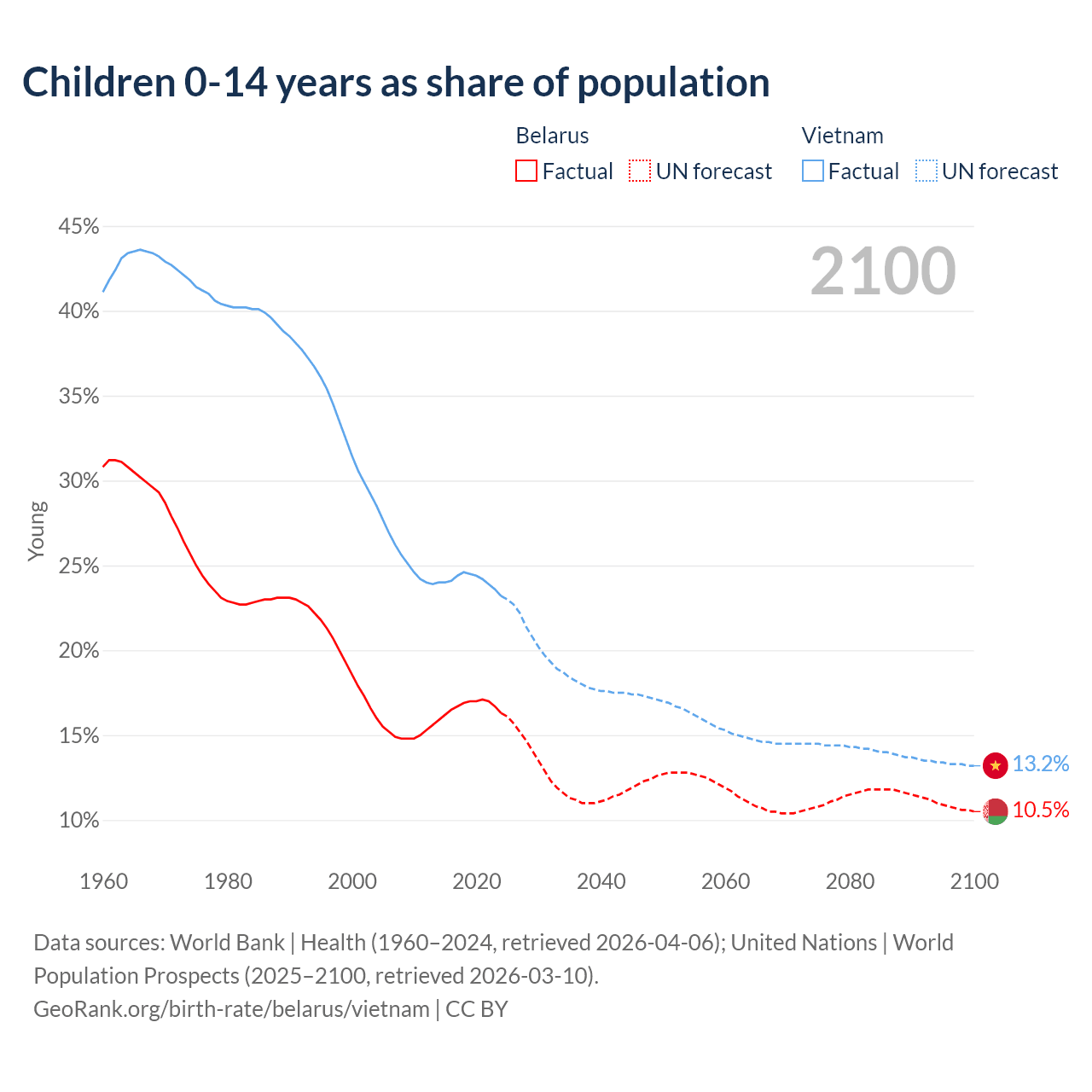 Belarus has an annual birth rate of 7.14 births per 1,000 people, compared to 13.8 for Vietnam. The average number of children a woman is expected to have during her lifetime — the fertility rate, is 1.21 in Belarus and 1.91 in Vietnam — 58.4% difference.