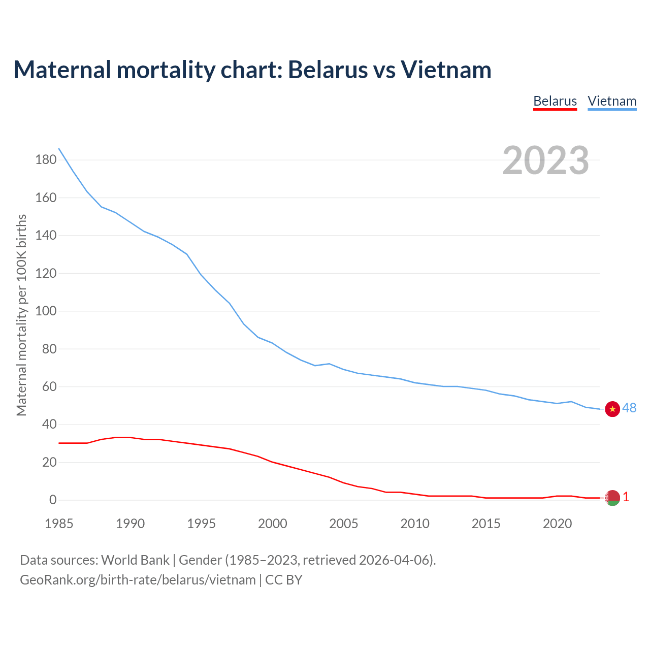 The maternal mortality rate, which is the probability of dying during childbirth or within 42 days of pregnancy termination, is 1 deaths per 100,000 live births in Belarus, compared to 48 deaths in Vietnam.