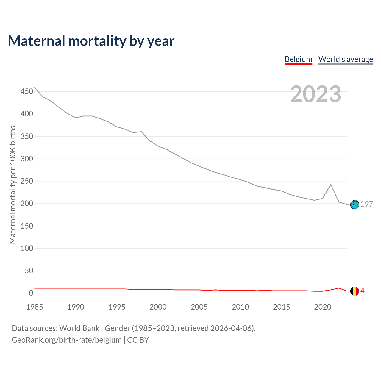 The maternal mortality rate in Belgium was 4 deaths per 100,000 live births in 2023 — a 0.004% chance of dying during childbirth or within 42 days of pregnancy termination. This is a 50% decrease compared to the year 2000.