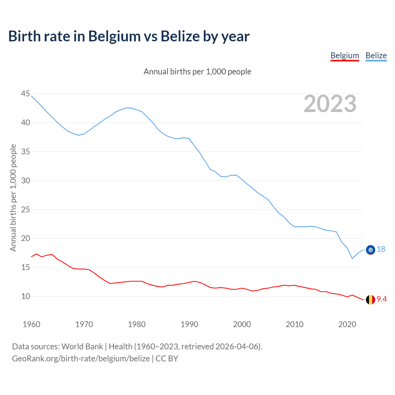 Belgium has an annual birth rate of 9.4 births per 1,000 people, compared to 18 for Belize. The average number of children a woman is expected to have during her lifetime — the fertility rate, is 1.47 in Belgium and 2.01 in Belize — 36.5% difference.