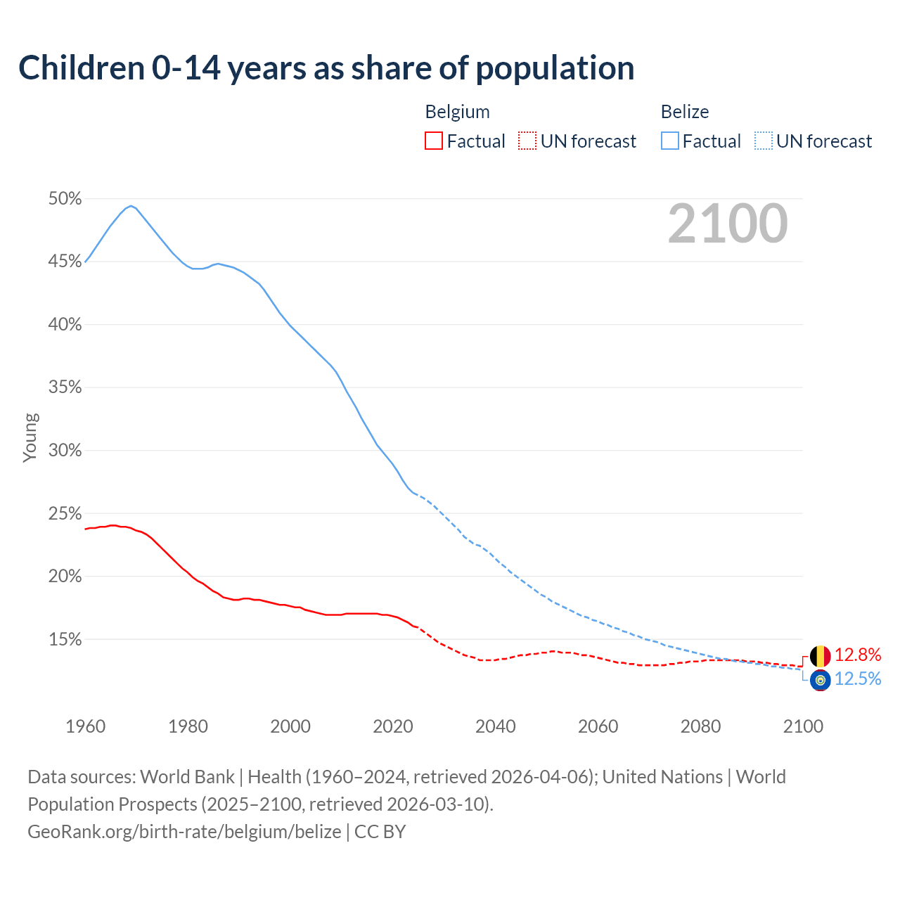 According to the latest available data on birth rates, the fertility rate in Belgium was 1.47 children per woman in 2023, compared to 2.01 in Belize in 2023. The replacement level is considered to be 2.1 children per woman.