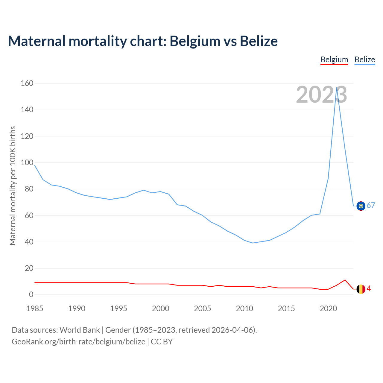 The maternal mortality rate, which is the probability of dying during childbirth or within 42 days of pregnancy termination, is 4 deaths per 100,000 live births in Belgium, compared to 67 deaths in Belize.