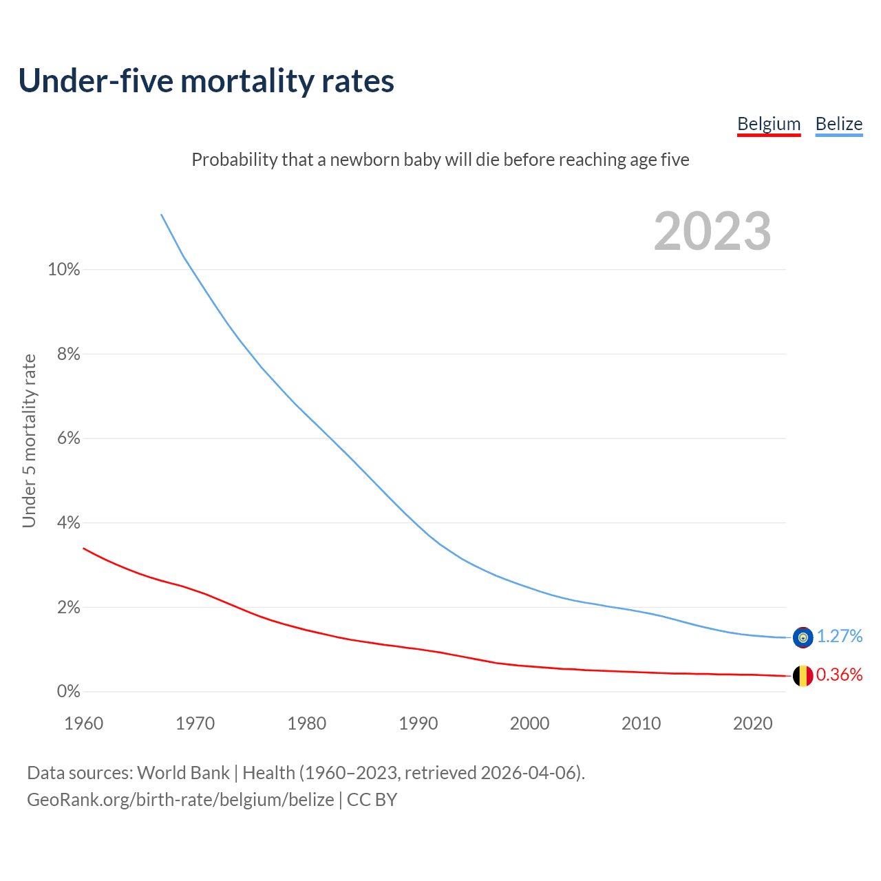 The chance that a newborn baby will die before reaching age five is 0.36% in Belgium and 1.27% in Belize. Above is a chart with historical data on under-five mortality rates.
