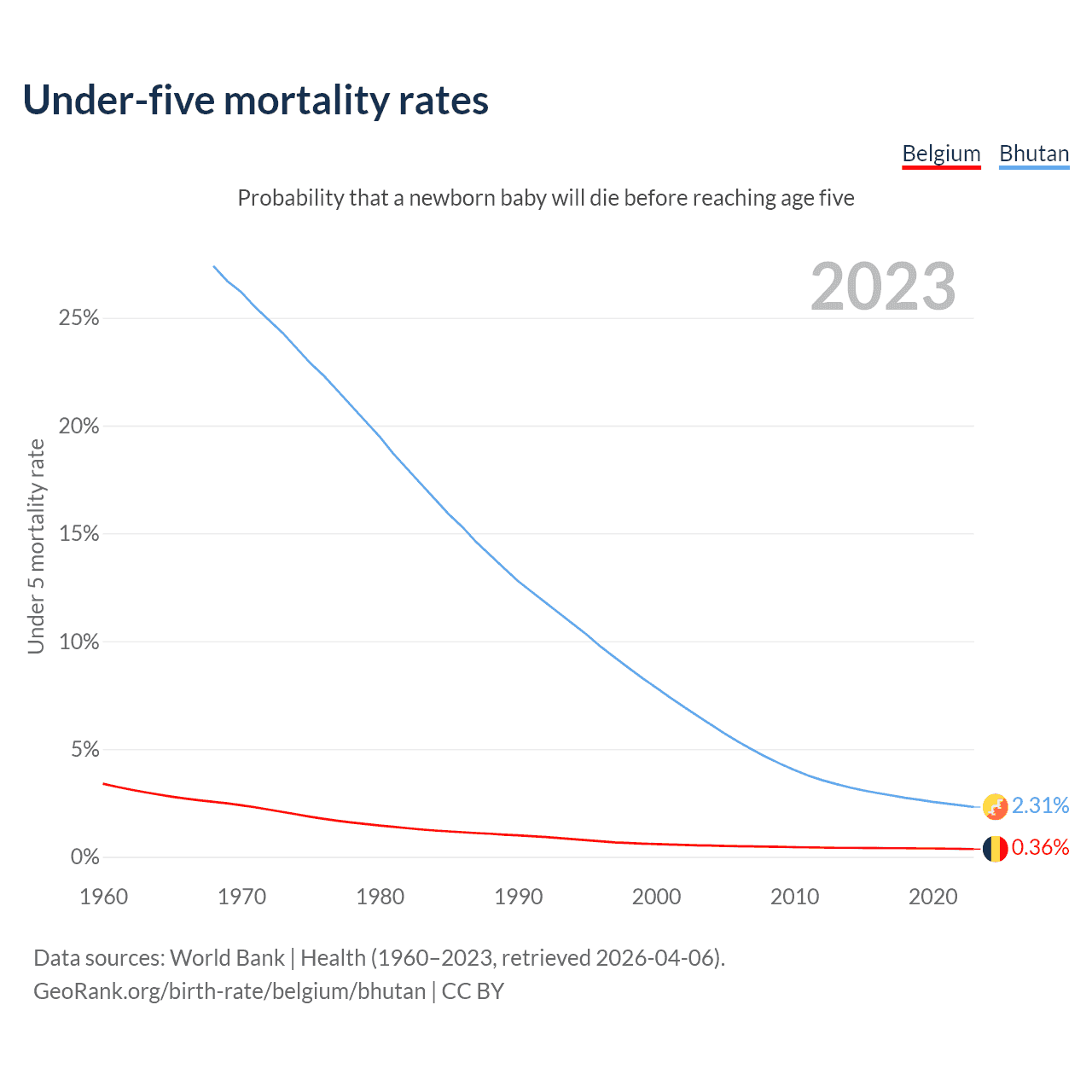 The chance that a newborn baby will die before reaching age five is 0.36% in Belgium and 2.31% in Bhutan. Above is a chart with historical data on under-five mortality rates.
