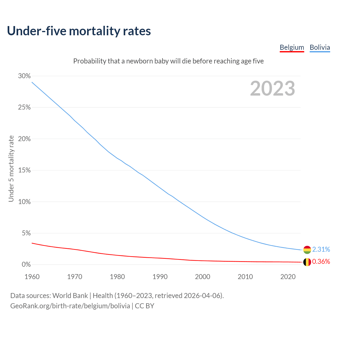 The chance that a newborn baby will die before reaching age five is 0.36% in Belgium and 2.31% in Bolivia. Above is a chart with historical data on under-five mortality rates.