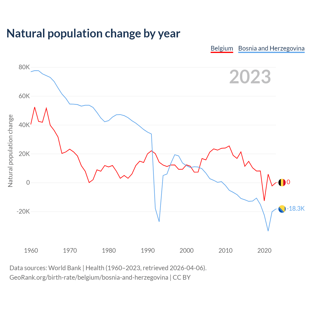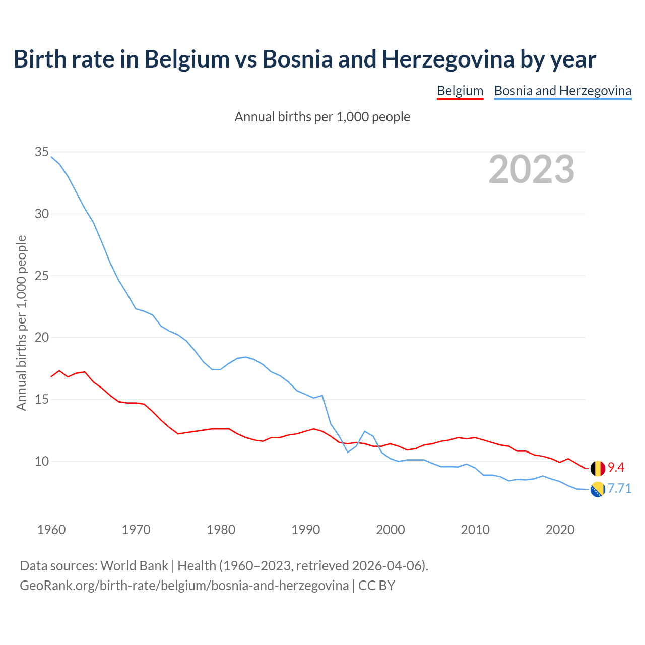 Belgium has an annual birth rate of 9.4 births per 1,000 people, compared to 7.71 for Bosnia and Herzegovina. The average number of children a woman is expected to have during her lifetime — the fertility rate, is 1.47 in Belgium and 1.49 in Bosnia and Herzegovina — 1.09% difference.
