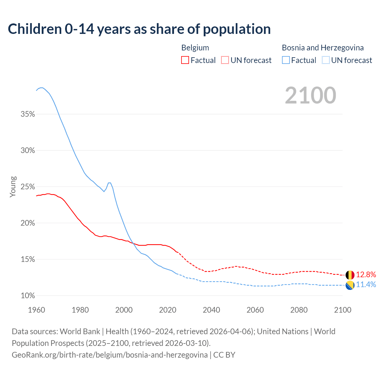 According to the latest available data on birth rates, the fertility rate in Belgium was 1.47 children per woman in 2023, compared to 1.49 in Bosnia and Herzegovina in 2023. The replacement level is considered to be 2.1 children per woman.