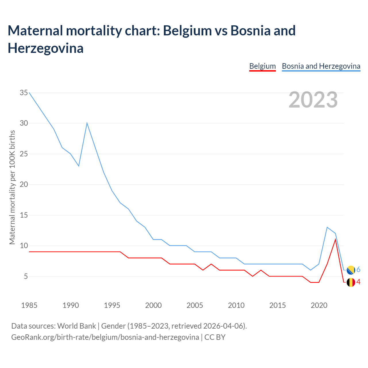 The maternal mortality rate, which is the probability of dying during childbirth or within 42 days of pregnancy termination, is 4 deaths per 100,000 live births in Belgium, compared to 6 deaths in Bosnia and Herzegovina.