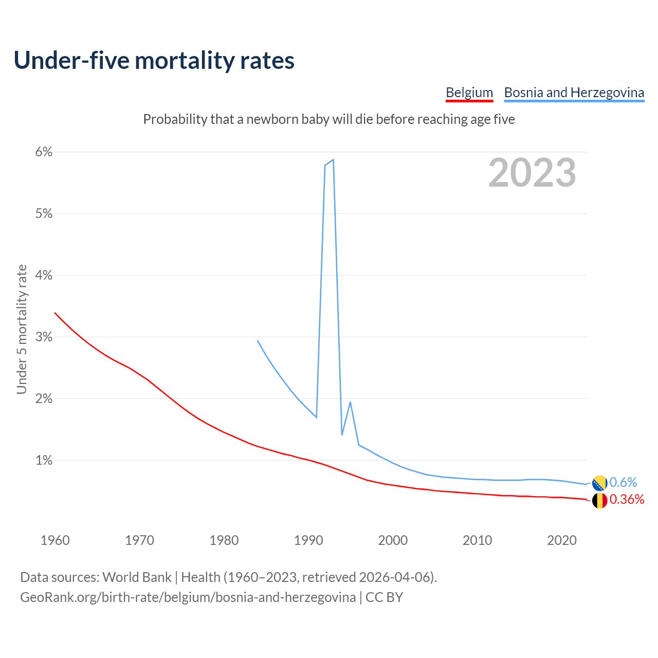 The chance that a newborn baby will die before reaching age five is 0.36% in Belgium and 0.6% in Bosnia and Herzegovina. Above is a chart with historical data on under-five mortality rates.
