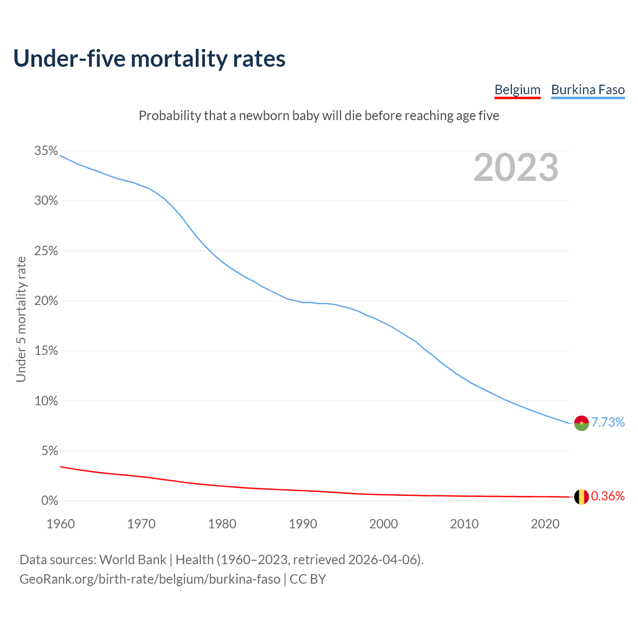 The chance that a newborn baby will die before reaching age five is 0.36% in Belgium and 7.73% in Burkina Faso. Above is a chart with historical data on under-five mortality rates.