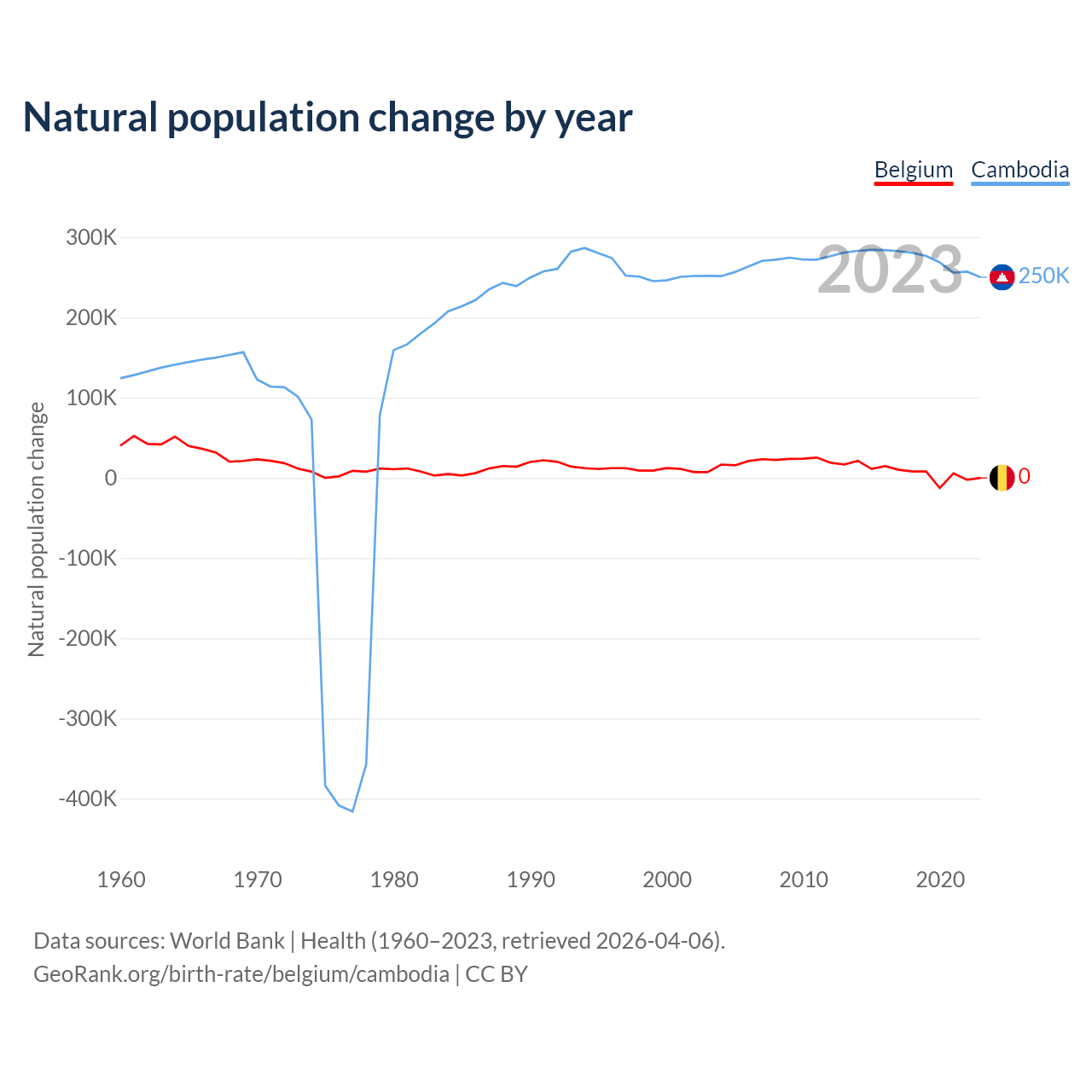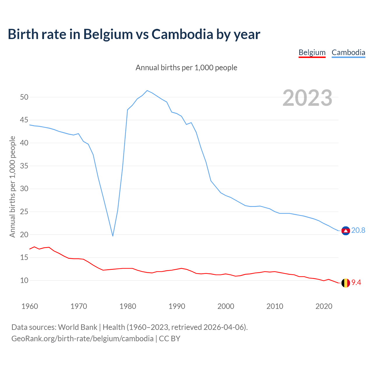 Belgium has an annual birth rate of 9.4 births per 1,000 people, compared to 20.8 for Cambodia. The average number of children a woman is expected to have during her lifetime — the fertility rate, is 1.47 in Belgium and 2.58 in Cambodia — 75.4% difference.